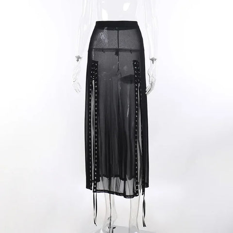 Discover our long skirt designed exclusively for alternative style enthusiasts. The Y2K Gothic Cut-Out Black Skirt is simply enchanting with its bold cutouts and eyelet details. Its angular silhouette and play of sheerness will add a mystical allure to your wardrobe. Crafted from a blend of quality materials, this skirt will be your standout asset no matter the occasion. Its high waist is tailored to accentuate your curves and give you a petite, endless silhouette. Pair it with your favorite top or a crop top for an outfit that is both rebellious and stylish. Wear this skirt with bold ankle boots or platform shoes for the perfect gothic look. Let your imagination run wild and assert your unique style with this statement piece that is sure to turn heads.