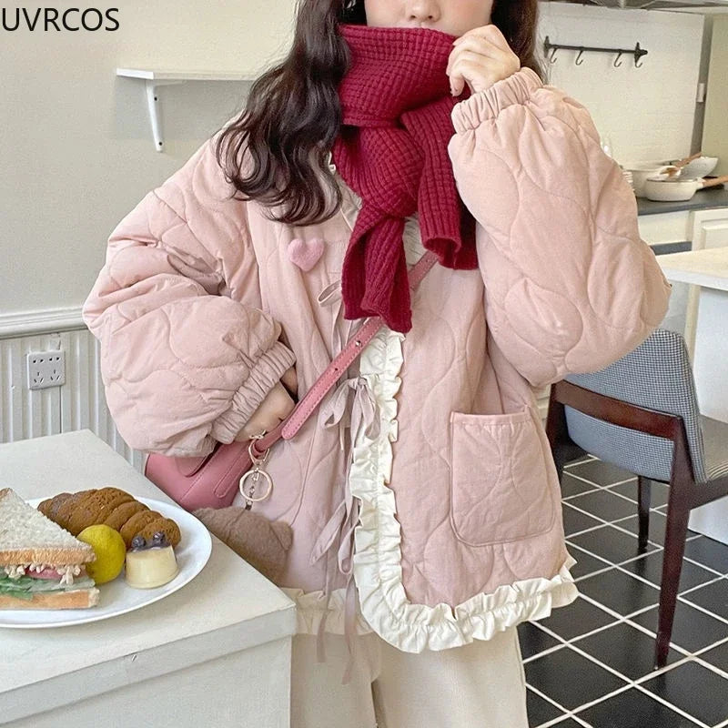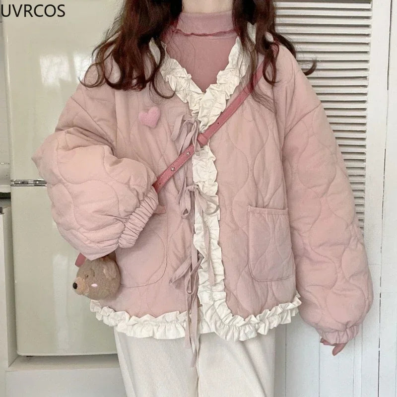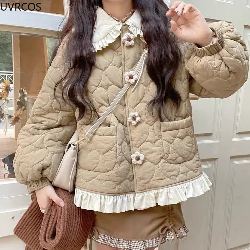 Let yourself be swept away by a wave of winter softness - with our Cozy Winter Jacket in Korean style, crafted for the fashion-conscious with a touch of imagination. This unique jacket, inspired by the avant-garde streets of Seoul, combines comfort and shine to skillfully complement your alternative wardrobe. The jacket is made from a durable, cozy quilted fabric and features a versatile beige tone as soft as the first snowflakes. The ruffled collar adds a touch of romance and recalls the grace of snow-covered landscapes, while the buttons adorned with a floral pattern lend an air of delicacy. The loose fit ensures unparalleled freedom of movement and a relaxed silhouette. This little gem is finished with a hem featuring contrasting ruffles, which pairs wonderfully with shorts or a checked skirt to create a newly interpreted Y2K look filled with charm and character. Wear it for a stroll through your favorite neighborhood or a cozy afternoon at the corner café and feel as extraordinary as the aesthetic of this piece. Warm up your style and your heart with this exceptional winter jacket that is sure to capture admiring glances.