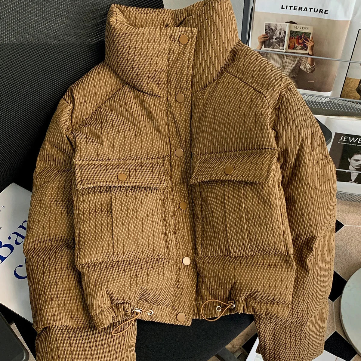 Warm up your style this winter with our Korean-inspired quilted parka, designed for those who want to combine comfort with trend awareness. Made from thick cotton and padded, this piece promises to keep you warm while showcasing a striking look. The jacket is dyed in a timeless camel tone and features a diagonal quilted pattern that offers rich texture and a voluminous silhouette without compromising on lightness. Utility features such as spacious flap pockets and a protective hood are combined with design details like the drawstrings at the waist and cuffs, allowing you to adjust the fit for a personalized shape. The contrasting buttons add a subtle touch of sophistication. This parka is perfect for everyday wear or a city adventure in cold weather, and it’s the centerpiece that perfectly complements your alternative wardrobe. Pair it with high-waisted trousers and combat boots for a chic grunge look, or leave it open over a flowing dress for a touch of Y2K glam. Don’t wait any longer and grab this parka that combines Korean style with cozy comfort for a stylish winter.