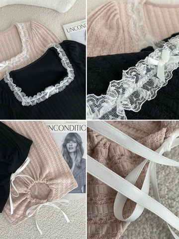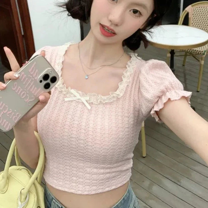 Discover the ultimate cuddle factor with our puff sleeve T-shirt for women, featuring an irresistible Korean aesthetic. In a delicate pink shade reminiscent of a cotton candy dream, this top is your ticket to a fashionable yet delightfully retro-inspired look. The structured fabric gently hugs your figure and promises comfort and style all day long. The delicately cut collar adorned with festive lace trim adds a touch of playful femininity to the top. Note the lacing, a cheeky wink that spices up the innocence of the garment. The puff sleeves, reviving a past era, create an airy structure and graceful volume that subtly accentuates the silhouette. A small, discreet bow completes the collar, a finish that exudes timelessness. This T-shirt pairs perfectly with high-waisted jeans for a casual outing or a midi skirt for playful elegance. It is an essential piece for any wardrobe inspired by alternative fashion, where every detail matters.