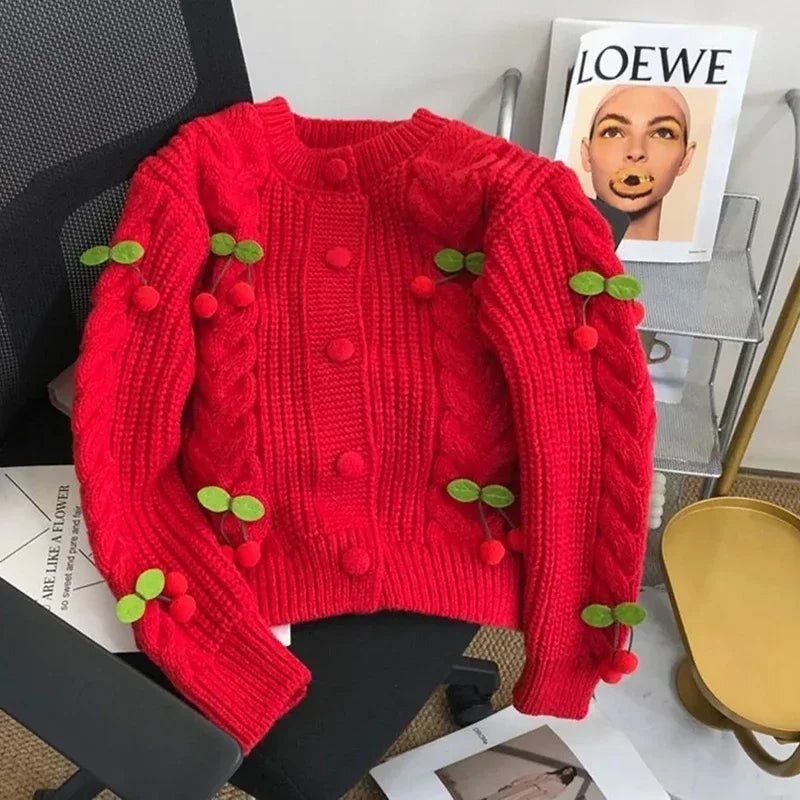 Fall in love with our Douceur Cerise cardigan, a must-have for autumn that combines comfort and style. This Korean knit sweater with long sleeves impresses with its elegant cream color and playful 3D cherry pattern, adding a sweet and whimsical touch to your wardrobe. The cardigan is made from high-quality material that feels soft and is pleasantly warm—perfect for snuggling up as the days get cooler. Cord details provide a rich texture, while the colorful cherry accents spread a cheerful vibe that brightens up any outfit. Whether worn alone or over a graphic t-shirt for a casual look, the Douceur Cerise cardigan is the ideal fashion statement for anyone who enjoys expressing themselves through their unique style.