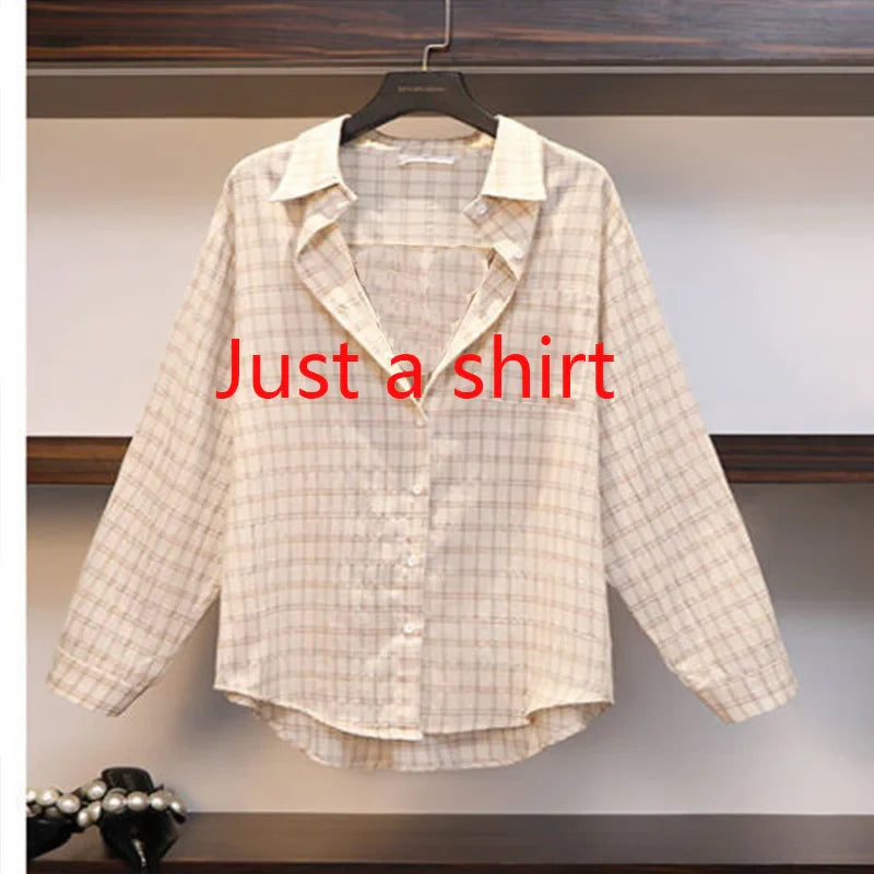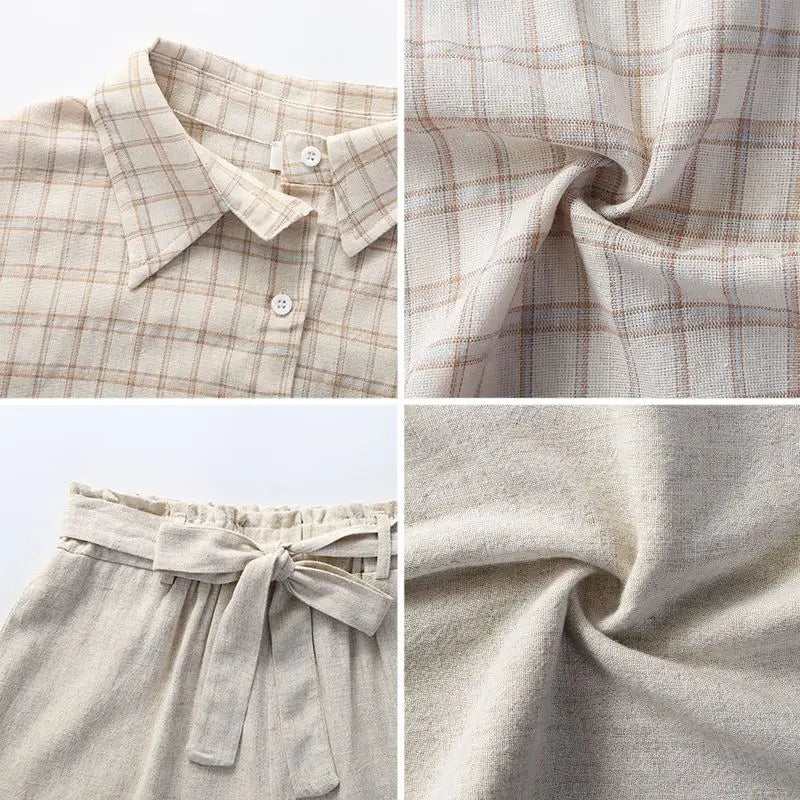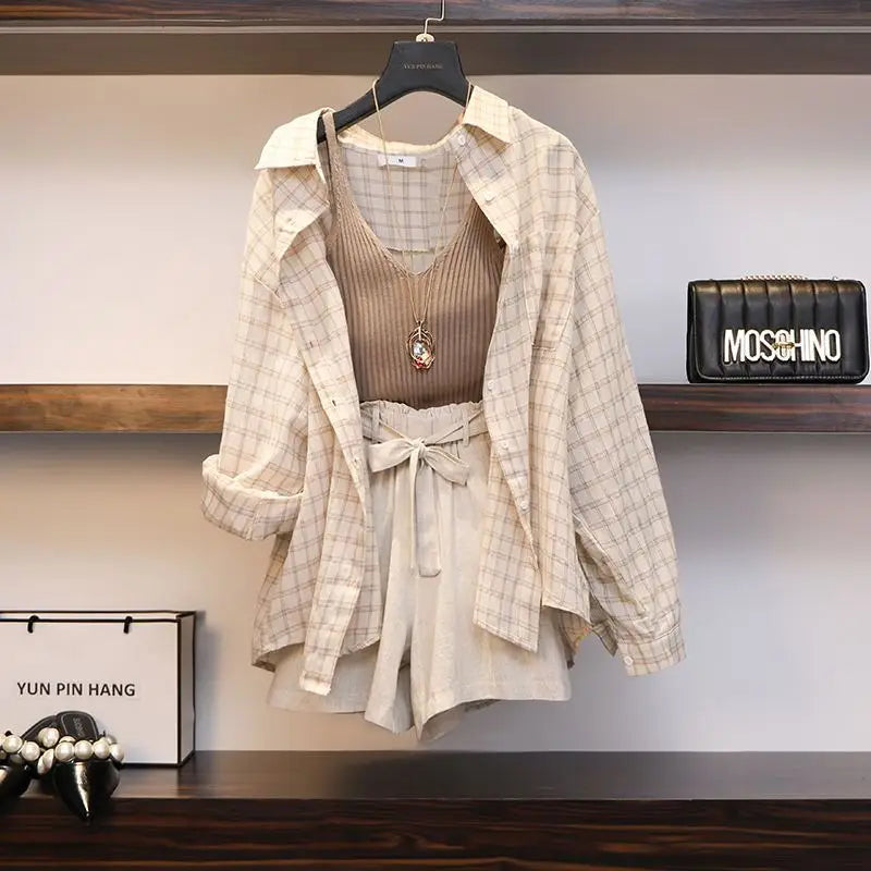 Immerse yourself in the charming and soft world of Light Academia fashion with this summery three-piece ensemble, specifically designed to accentuate the generous silhouette of women with a touch of delicacy and sophistication. The top is a fitted, taupe-colored tank top made of fine knit for optimal comfort and a flattering silhouette. It features a subtle V-neckline that highlights the natural charm of its wearer, while a pendant adds a touch of discreet elegance. The oversized shirt with slightly transparent cream-colored checks flirts with the summer breeze. The puff sleeves and elastic cuffs convey a poetic lightness, while the waist-tied belt invites a casual feminine touch. The shorts complete the ensemble, featuring a high elastic waistband with a bow that hugs the waist and flatters it.