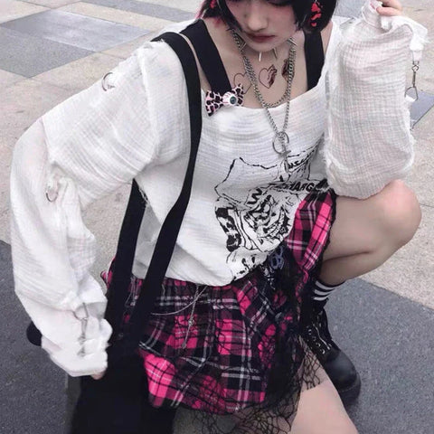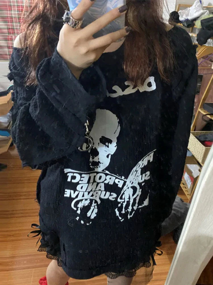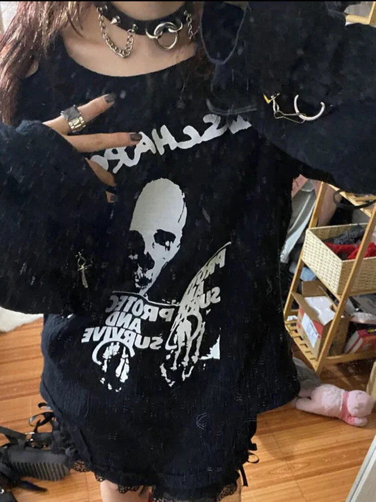 Dive into an alternative universe with our graphic one-shoulder T-shirt - a must-have for all lovers of grunge fashion and bold styles. This black T-shirt, made from a soft and comfortable material blend, features an eye-catching skull print that is sure to turn heads. The irregular, casual design, emphasized by the unique long sleeve, creates a trendy silhouette and a cool, refreshing look. Perfect for an evening with friends or to highlight your personality in everyday life, it pairs easily with ripped jeans or a plaid skirt. Express your creativity and rebellious spirit with this T-shirt that perfectly embodies the essence of alternative fashion. Make this unique piece your new loyal style companion!