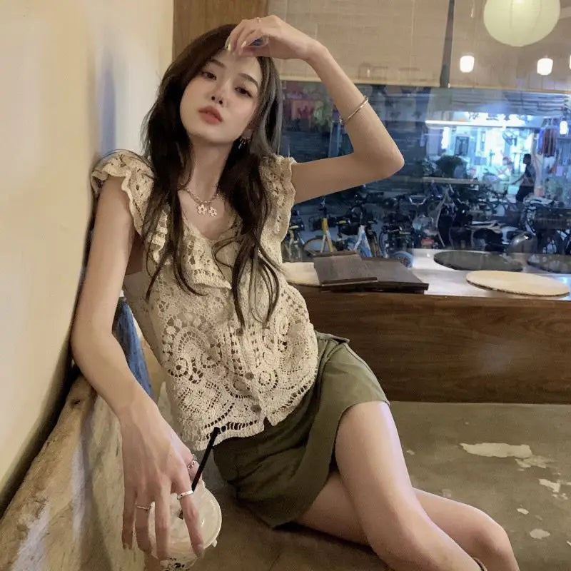 Discover the casual charm of our blouse in Bohemian Chic, crafted from pure cotton to ensure optimal wearing comfort on warm summer days. The delicate texture of the lace fabric creates a refined play with transparency and gives your outfit an airy lightness. This blouse features a romantic, slightly tailored cut and showcases a row of delicate buttons on the front, bringing a touch of vintage to your wardrobe. The short, flared sleeves accentuate your arms with subtle grace, while the square neckline elegantly outlines your décolletage. Whether for a trip to the terrace or a stroll through the city, this sleeveless blouse is the ideal companion to create a summer look characterized by elegance and lightness. Combine it with high-waisted pants or a flowing skirt to highlight the lines and the stripe pattern with lace. This blouse is made for the modern woman who wants to blend comfort with style. It is a must-have for a beautiful summer.