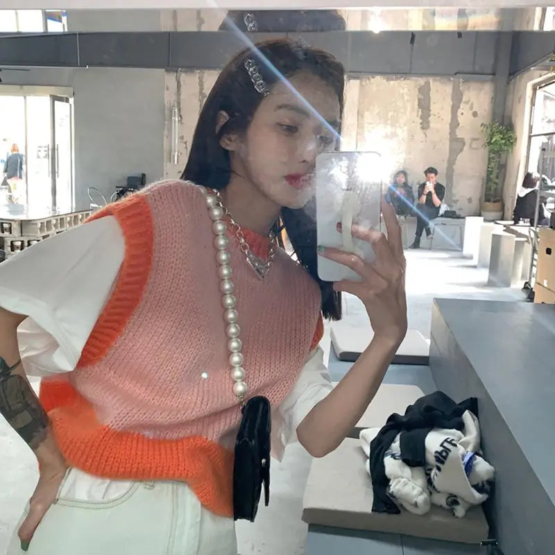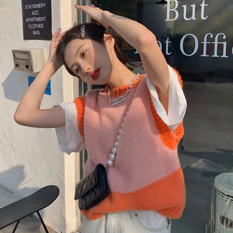 Immerse yourself in the soft and artistic world of the Soft Girl with our latest sleeveless sweater! This cardigan with a round neckline is made from high-quality knit material and promises cozy comfort with a touch of originality. The patchwork design combines soothing pink and orange tones into an irresistible gradient effect that catches the eye. Sleeveless and loose-fitting, this sweater offers absolute freedom of movement and is perfect for layering. Imagine it as shown over a long-sleeved white shirt for a preppy look, or pair it with a simple T-shirt for a casual yet polished appearance. The ribbed finish along the collar, shoulders, and bottom hem provides a contrasting texture while ensuring a comfortable fit. Whether you opt for an outing with friends or a study-intensive afternoon at the corner café, this sleeveless sweater is the centerpiece that has been missing from your Soft Girl wardrobe. Add a few accessories, such as a pearl necklace for a touch of sophistication, and you're ready to conquer the world with style and originality.
