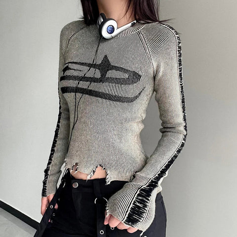 Discover a pullover that combines grunge nakedness with subtle futurism. This torn and sewn Techwear Harajuku long-sleeve pullover will establish itself in the wardrobe of those daring to defy conventions. With its boldly torn aesthetic and Harajuku-inspired graphic prints, it perfectly embodies the rebellious and innovative spirit. The high-quality knit represents durability and feels unexpectedly soft. Sprinkled with graphic black accents on a gray background, the design of this pullover is a true style statement. Strategic rips create a deliberate used effect, while the raw edges on the sleeves and hem underline the unconventional character of this garment. This pullover is perfect for adding an original touch to your everyday outfits and pairs excellently with black cargo pants or a punk-style skirt. Add robust boots or high-top sneakers to complete the look.