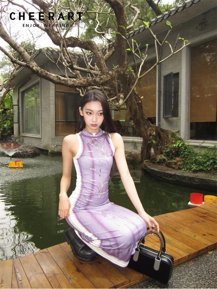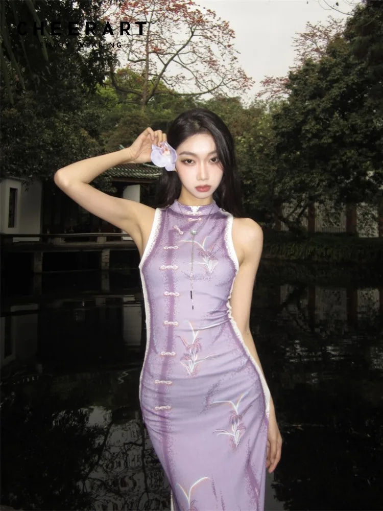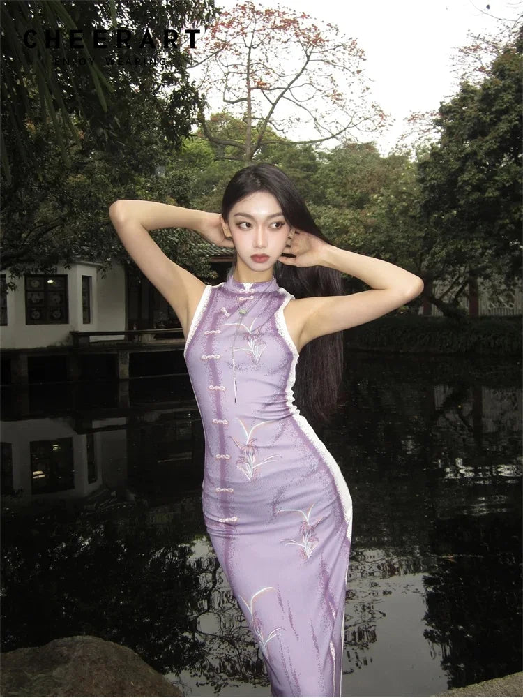 Lila Cheongsam Dress in Vintage Design with Sleeveless Silhouette