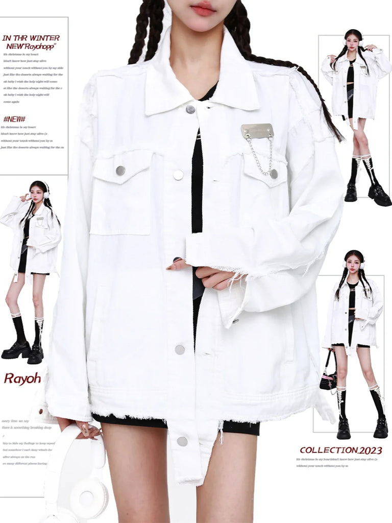 レトロな魅力を放つこのアンストラクチャード デニム ジャケットを着て、オルタナティブ ファッションの世界に浸りましょう。このソリッドなオーバーサイズのホワイト ピースは、新しく解釈された Acubi トレンドへのオマージュであり、単調な服に敢えて挑戦する人のためにデザインされています。このジャケットは、個性と表現の自由を叫ぶ、すっきりとした使い古したエッジを備えたカジュアルでテーパードした外観が特徴です。長袖とゆったりとしたフィット感が快適さと利便性を確保し、輝くホワイトはあなたのスタイリッシュな冒険に万能な背景を提供します。リトル ブラック ドレスと強いコントラストをつけて組み合わせても、柄物の e-girl トップスの上に重ねても、このジャケットは万能性の定義です。メタル ボタンや実用的なポケットなどのディテールがデザインを完成させ、このピースは美しいだけでなく機能的です。Acubi Fashion のスタイルを取り入れ、このデコンストラクト デニム ジャケットをオルタナティブ ワードローブの要にしてください。