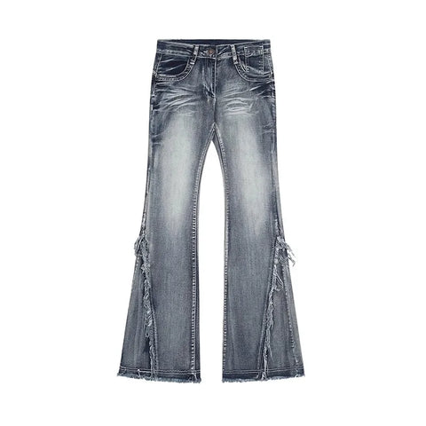 裾のパッチワークデザインがトレンドのY2Kルックにぴったりなフレアジーンズ