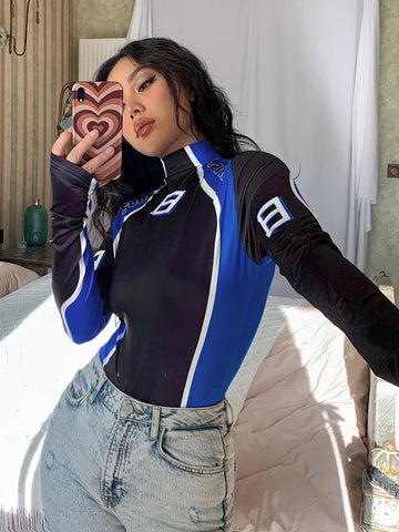 オルタナティブファッションの最前線に躍り出る長袖ボディスーツで大胆なスタイルをアピールしましょう。サイクリングウェアの美学からインスピレーションを得たこのトップスは、スポーティなテクノロジーのタッチでどんな体型も引き立てるぴったりとしたカットが特徴です。タートルネックと長袖が完璧に調和し、テックウェア文化を愛する人々にとって理想的なエレガントでダイナミックな外観を実現します。ディープブラックと鮮やかなブルーの組み合わせは、スピードとパフォーマンスを彷彿とさせる様式化されたプリントがアクセントとなった、エネルギッシュなグラフィックデザインを伝えます。体型にフィットする伸縮性のある素材で作られたこのボディスーツは、街中を縫うように走るときも、友人と夜を楽しむときも、快適さと動きやすさを保証します。カジュアルなジーンズと組み合わせると常識を打ち破り、このトップスは現代的なアーバンルックの中心的な要素になります。スピード、スタイル、快適さ - このボディスーツは単なる衣服ではありません。ファッション界における独立宣言です。