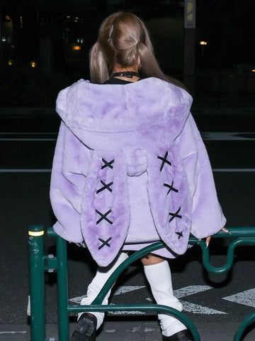 ウサギの耳が付いた特大のライラック色のフェイクファーコート