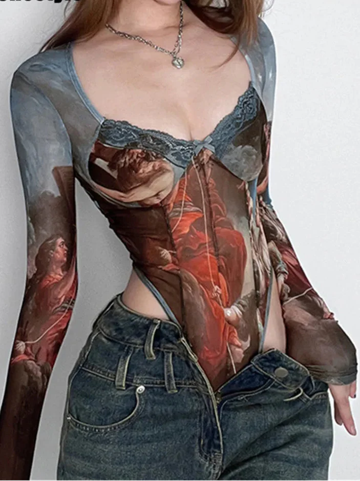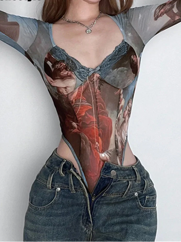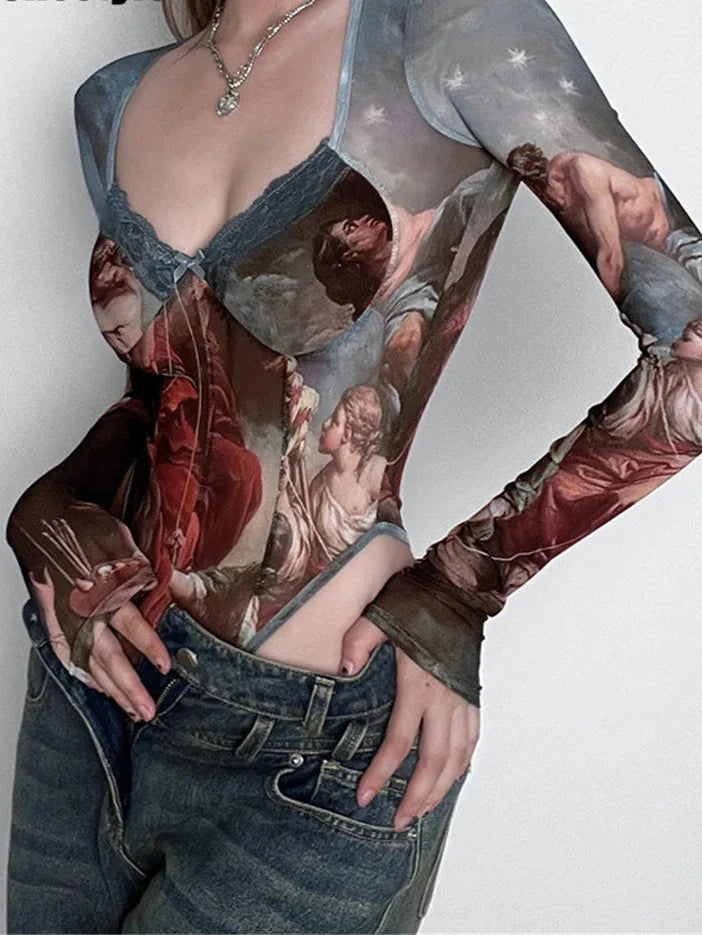 バロック芸術にインスピレーションを得たパターンが特徴のスクエアネックのニットトップを着て、芸術的なファンタジーの世界に足を踏み入れましょう。このモカブラックのボディスーツは、ウエスト部分のドラマチックなプリントを強調し、美的魅力と大胆さを兼ね備えています。ぴったりとしたデザインが体にぴったりフィットし、長袖が謎めいたルックの神秘性を高めます。