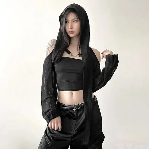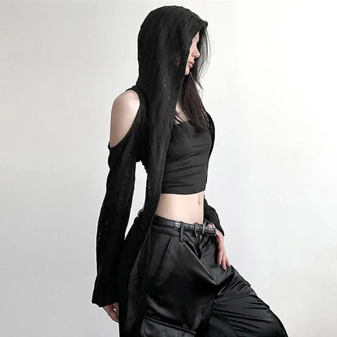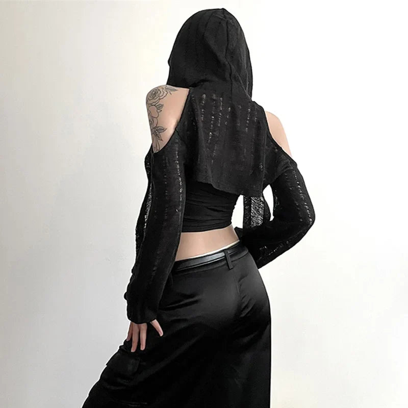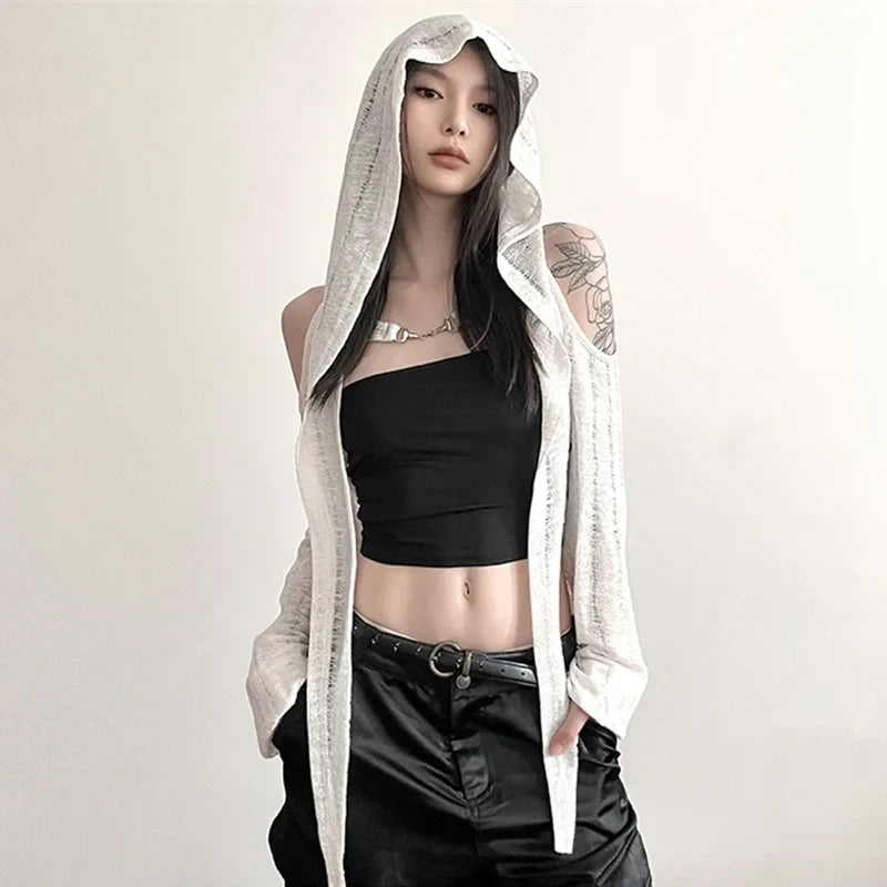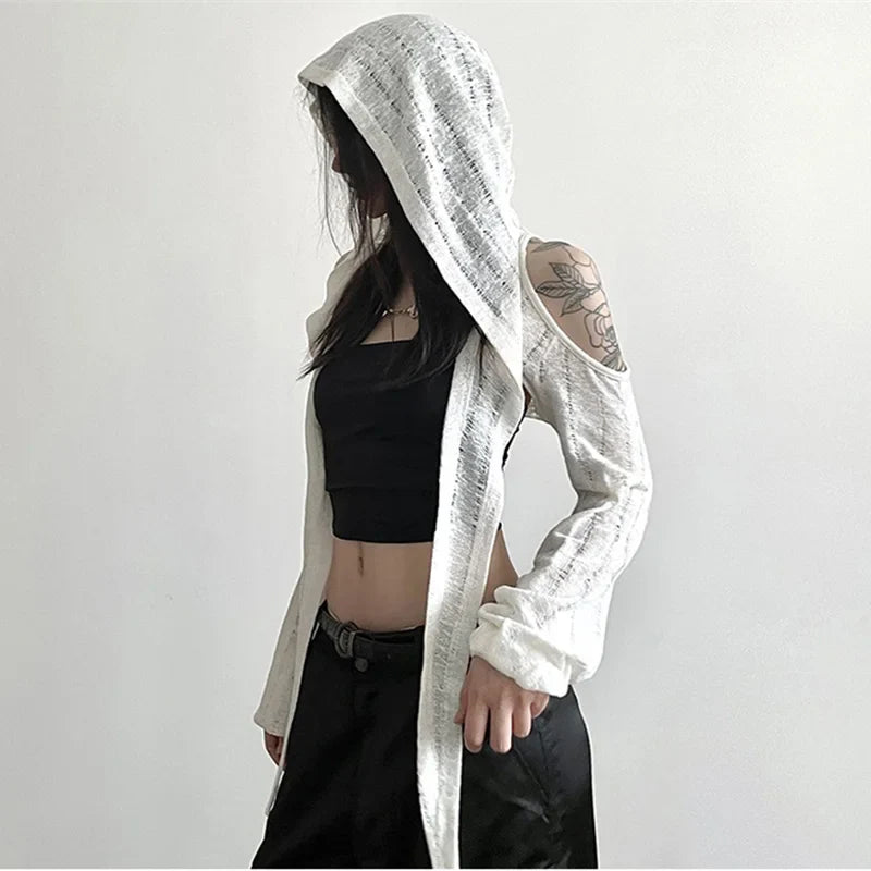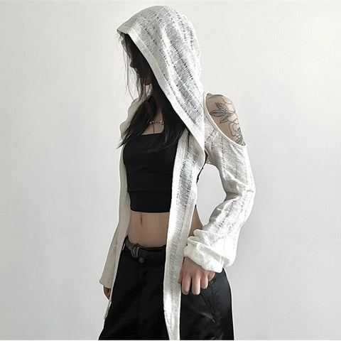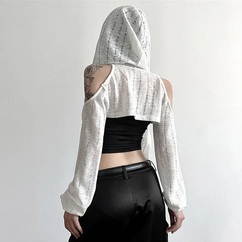 フードと肩の魅力的なカットアウトが特徴の、上質なニットで作られたクロスニットジャケットであなたのスタイルを一新しましょう! 明るいホワイトカラーとエレガントなカットが特徴のこのトップスは、Y3K スタイルを際立たせるのに最適です。