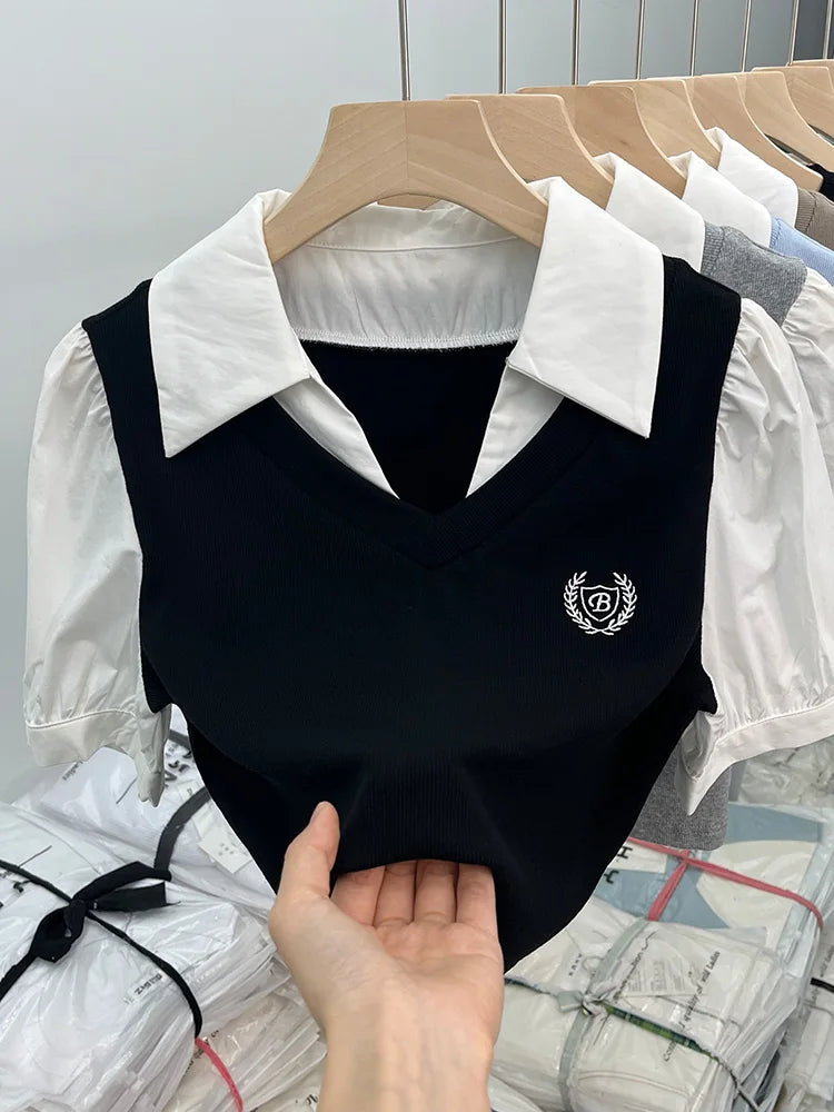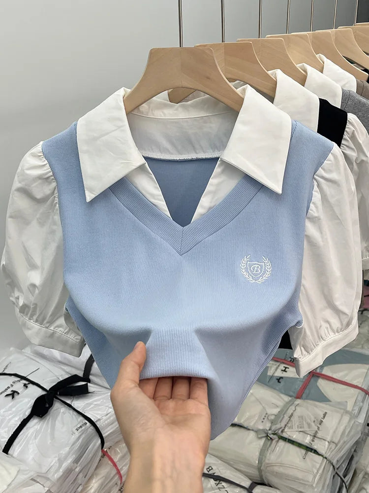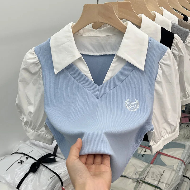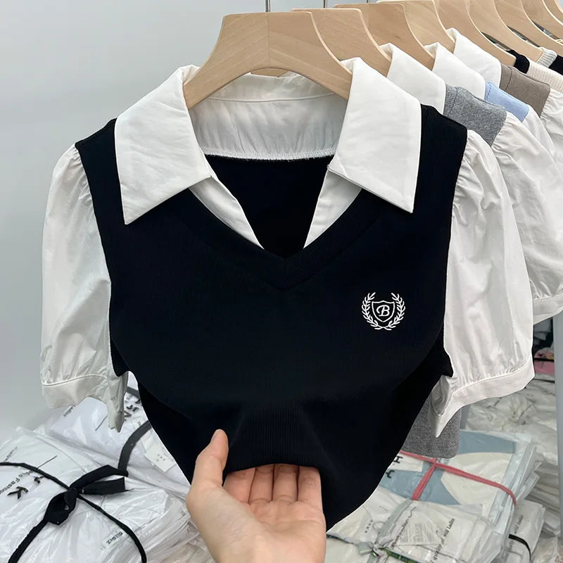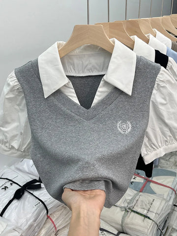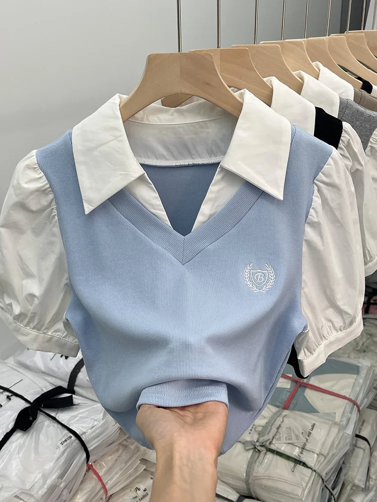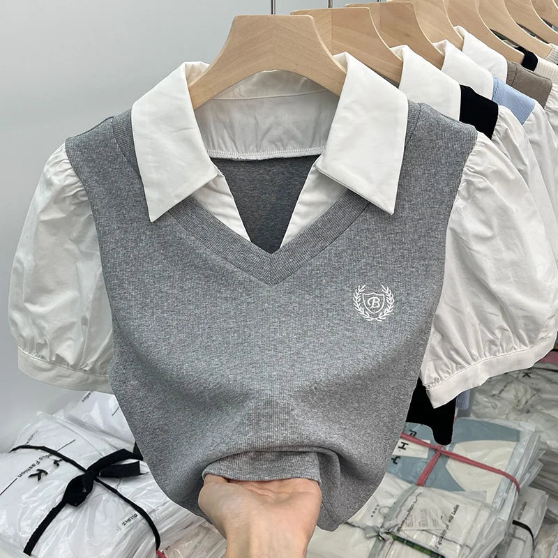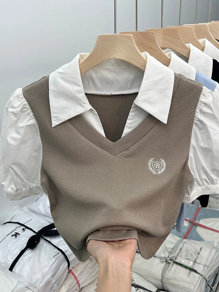 柔らかさと大胆さを見事に組み合わせたこの半袖ポロシャツで、洗練された韓国スタイルの世界に飛び込んでみましょう。カジュアルシックとレトロトレンドを完璧に体現した一枚です。純白の襟とボディのニュートラルブラウントーンの印象的なコントラストが視覚的な調和を生み出し、このトップスはあらゆるオルタナティブワードローブに欠かせないものとなっています。短くフィットするカットがシルエットを強調し、パフスリーブがフェミニンなタッチと昔を懐かしむ雰囲気を添えています。胸元の刺繍バッジが特別感を演出し、ポロシャツにさりげないエレガンスを添えています。深いVネックがスパイシーな雰囲気を添え、大胆なルックスと洗練されたシンプルさを組み合わせたい女性に最適です。