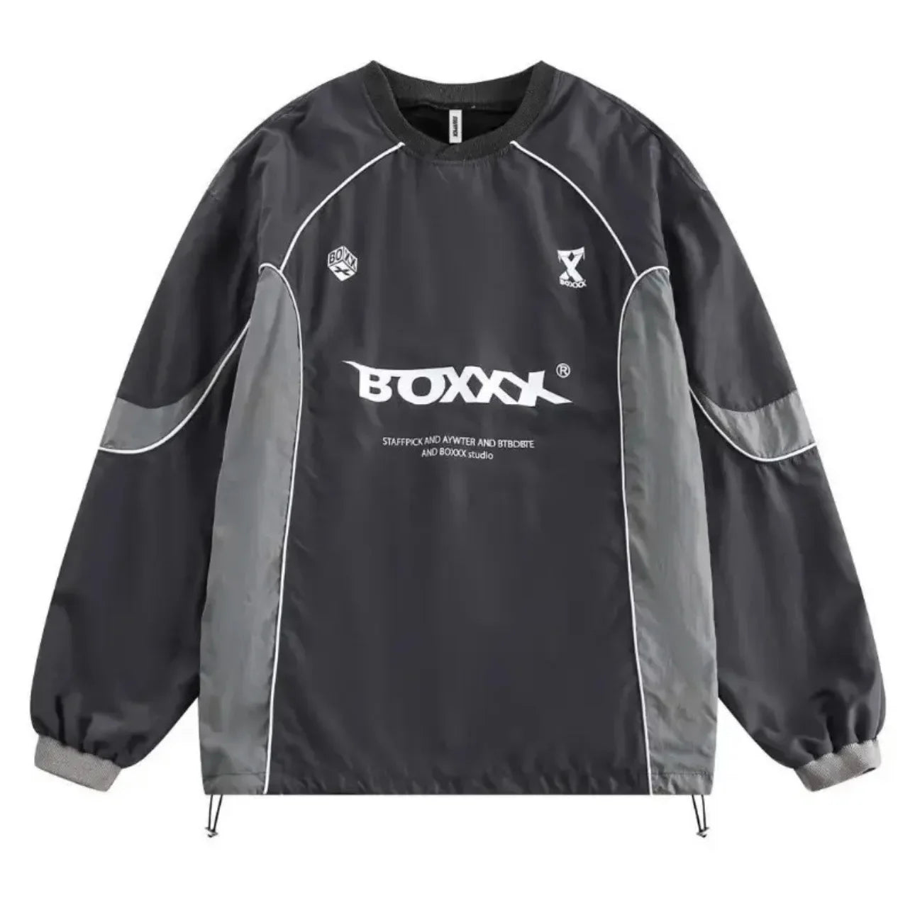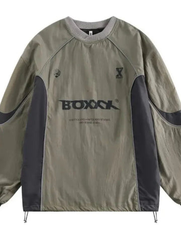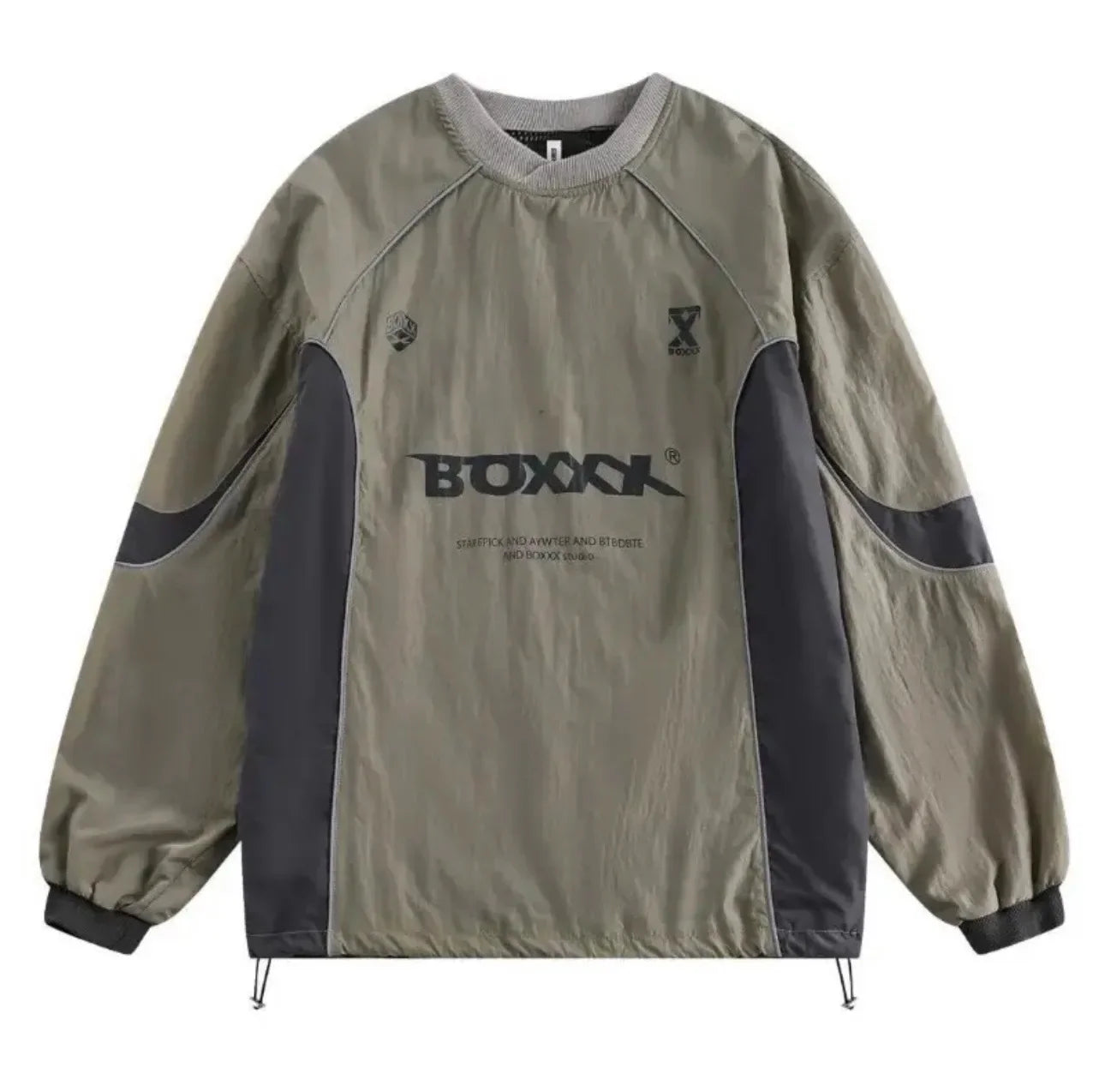 テックウェアのパッチワークパーカー、カーキとグレー、プリント「BOXXX」