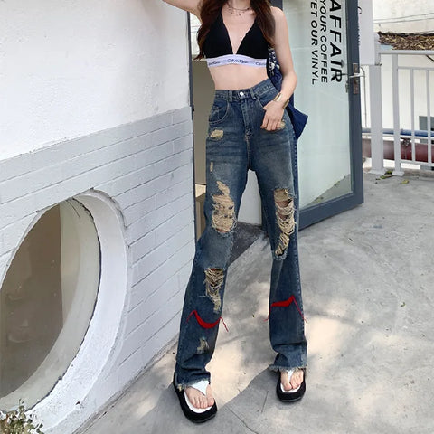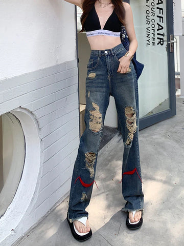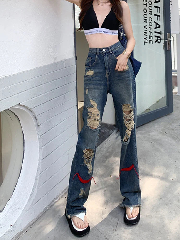 赤いアクセントが入ったダメージ加工のグランジジーンズ