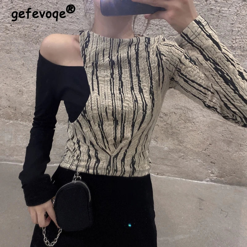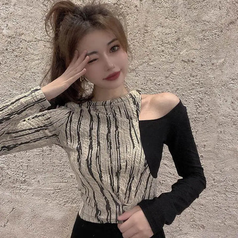 スタイリッシュに自分を主張したい女性のためにデザインされたセクシーな韓国風ロングスリーブ T シャツで、オルタナティブ ファッションの世界に飛び込みましょう。縦縞と印象的なパッチワーク パターンの組み合わせが大胆なルックスを生み出します。カットはエレガントなアシンメトリーで、片方の肩を露出させてセンシュアルな雰囲気を演出し、もう片方の腕はメイン パターンと対照的な黒いロングスリーブに包まれています。トップスは柔らかく快適な生地で作られており、体型にフィットしてシルエットを引き立てます。全体的に洗練されながらもカジュアルな印象で、友人との外出や都会での一日を過ごすのに最適です。この T シャツはハイウエストのスカートやスキニー ジーンズと合わせやすく、特別なものを求めるワードローブにぴったりのアイテムです。もう待つ必要はありません。韓国のファッション トレンドにインスパイアされたシックで型破りなこの T シャツで、普段着にさりげない誘惑のタッチを加えましょう。