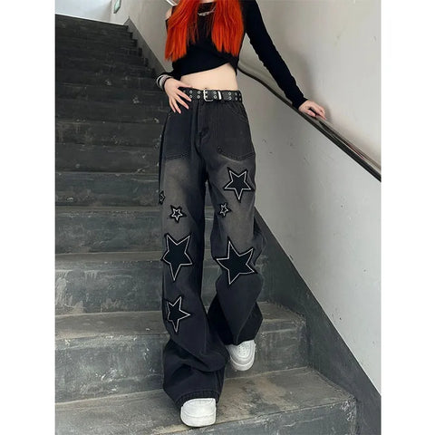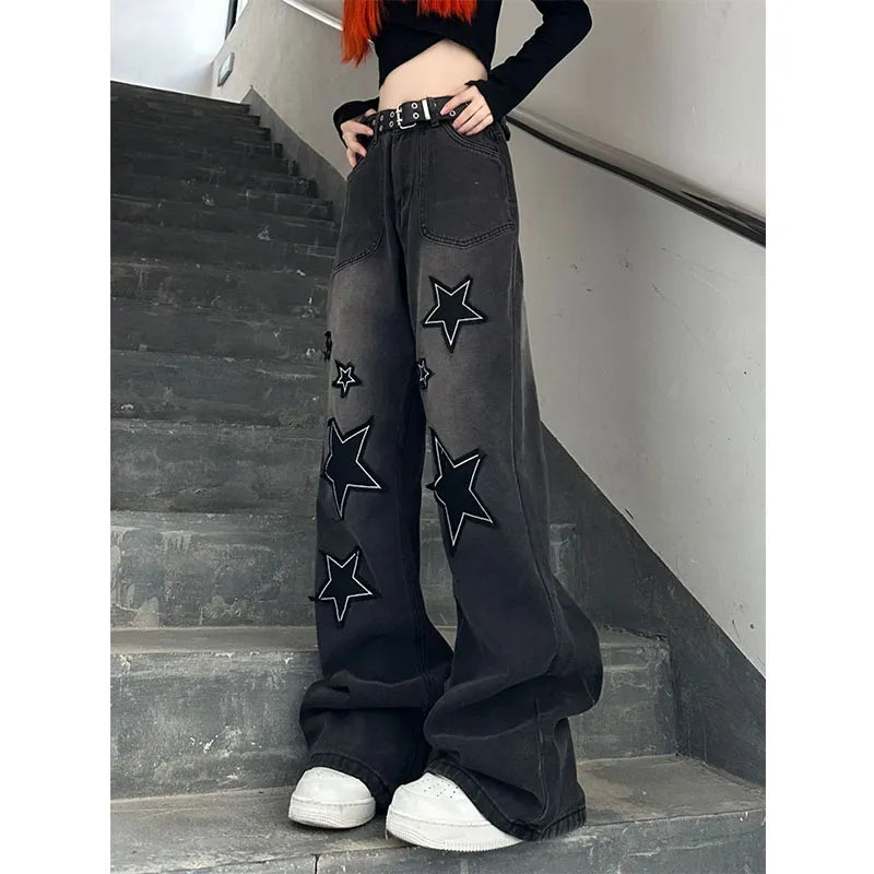 星の刺繍が施されたこのブラックグレーの色あせたジーンズは、ストリートウェアの限界を超えたスタイルです。シンプルな色使いが、ブレイクダンスのセッションに気軽に着ていけるクラシックな一着に仕上がっています。オーバーサイズのカットとパッチワークのディテールが、Y2K スタイルの時代を超えた一着となり、どんな場面でも着用できます。