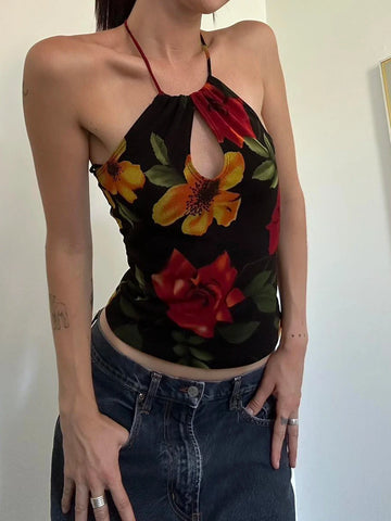 ソフトガールトップ チャーム フローラル フィット&エレガンス ホルター ブラック&レッド