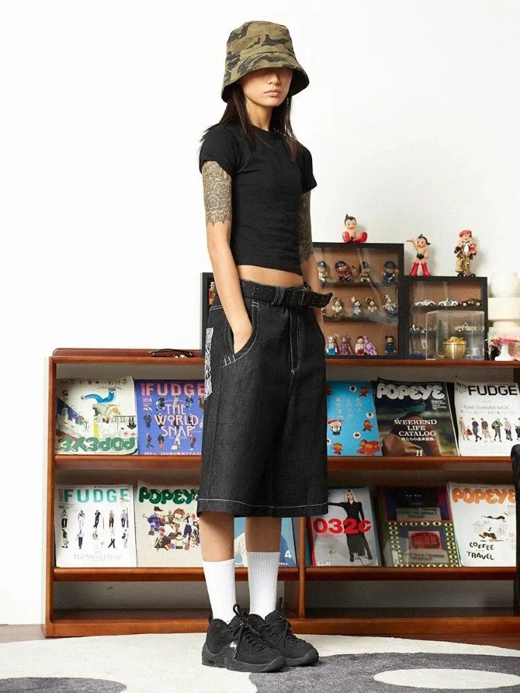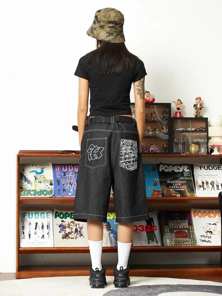 オーバーサイズのストリートウェアスタイルの刺繍入りレディースY2Kデニムショーツ