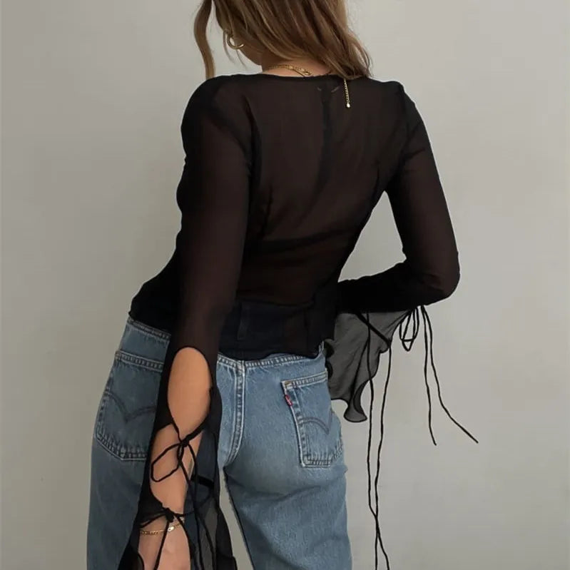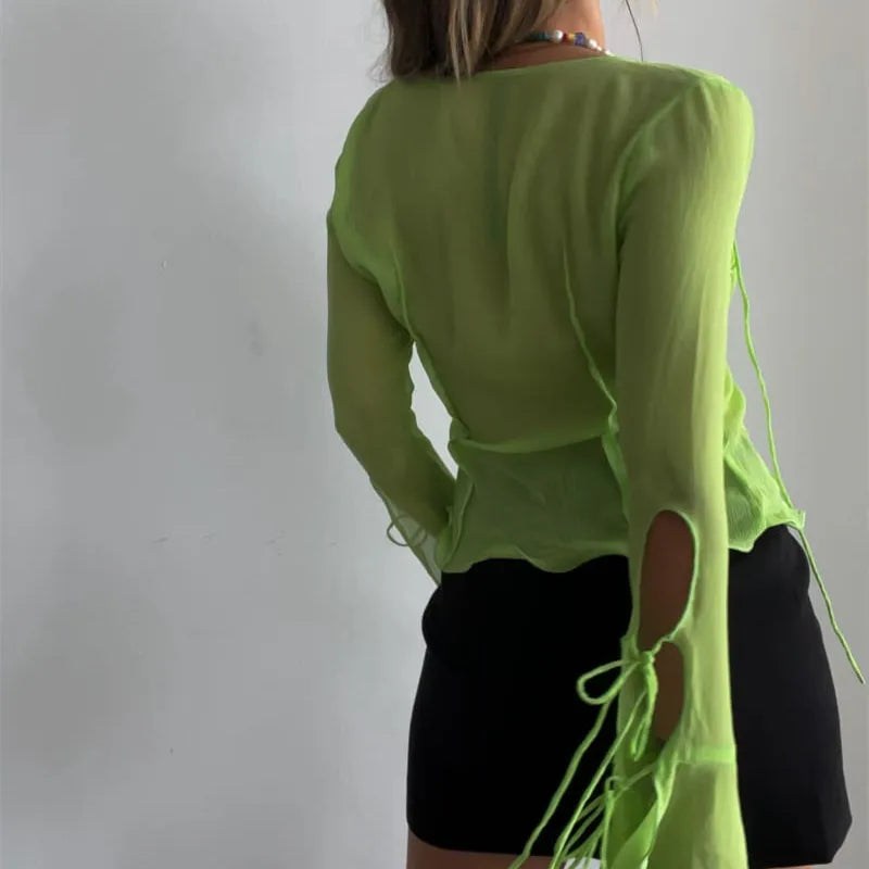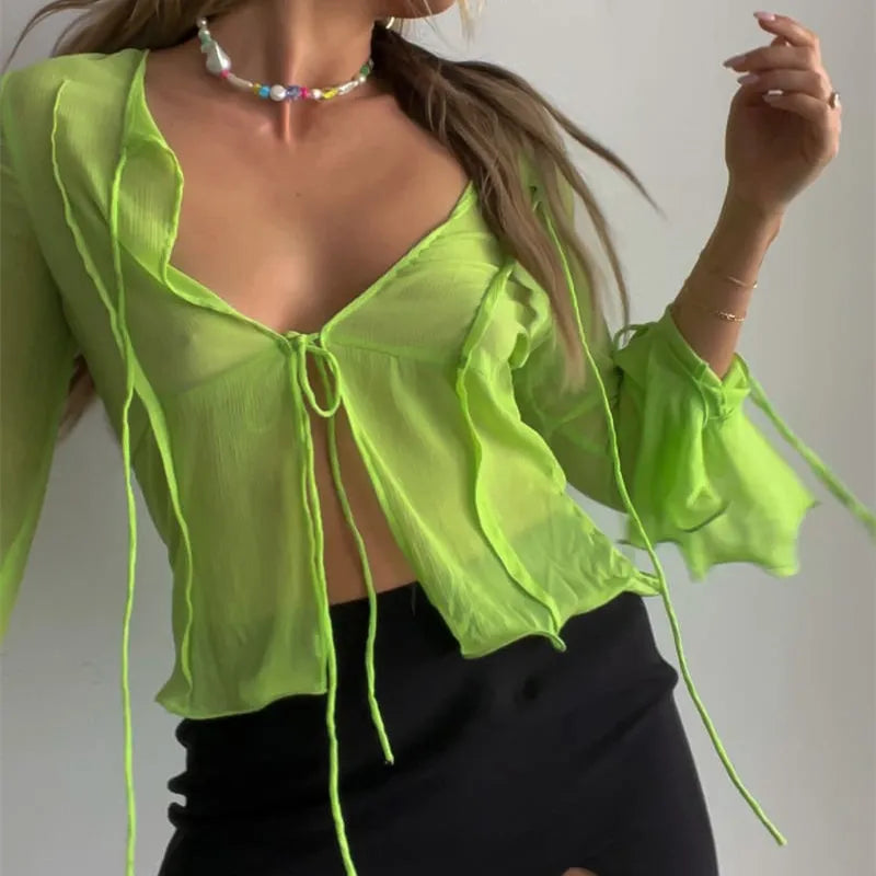 格子模様のカーディガンをご覧ください。Y2K 風の鮮やかなハイライトが印象的なレトロモダンな外観を実現します。この魅惑的で多用途な服に、懐かしさと前衛的なタッチが完璧に融合して、ワードローブを復活させます。魅力的な透明感を備えたこのカーディガンで、2000 年代初頭の象徴的な時代を体験してください。繊細なレース構造と目を引く鮮やかなネオングリーンを備えたエアリーな素材で作られています。バインディング用の細い紐で飾られたフロント開口部は、開いてカジュアルスタイルにしたり、フィットさせてシルエットを強調したりすることができます。フレアスリーブは、動きに詩的なスイングとエアリーなダイナミクスを加え、伸縮性のある裾は完璧なフィット感を保証します。このカーディガンはわずかに短く、お揃いのクロップトップや大胆なブラと組み合わせると、個性豊かなレイヤードルックに最適です。