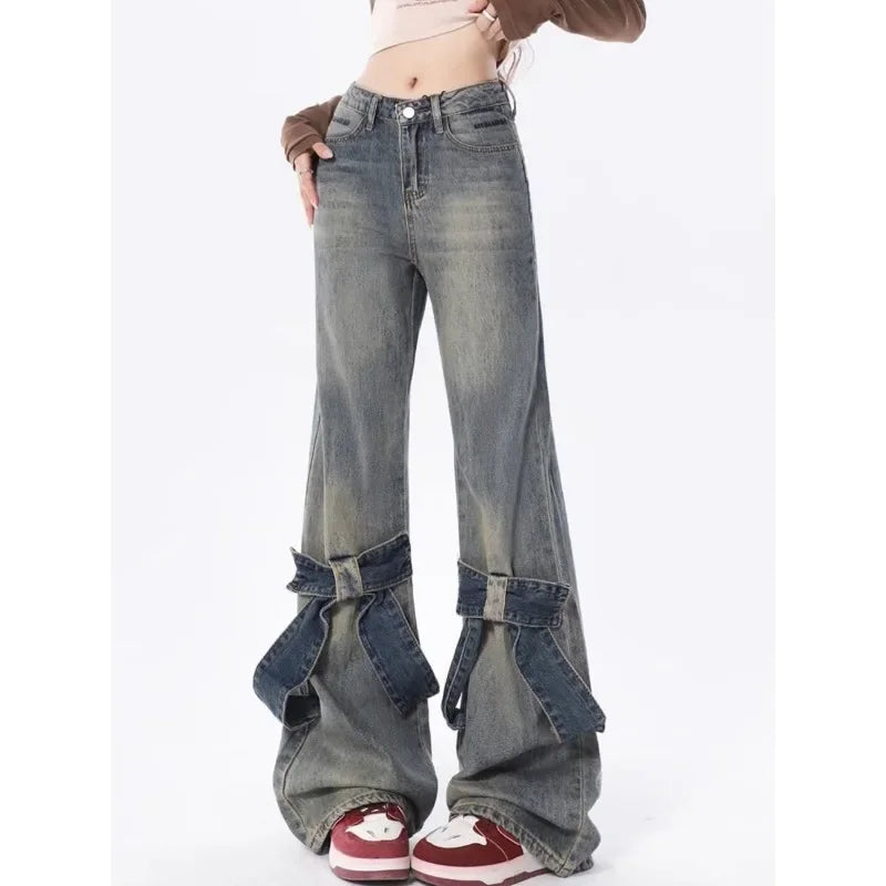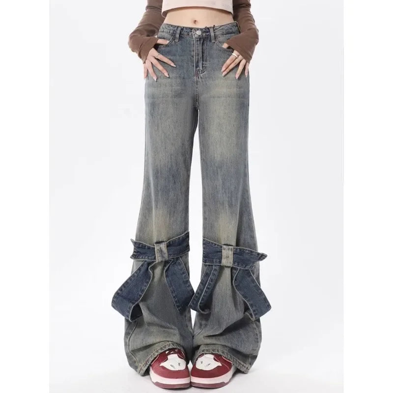 パッチワークリボン付きヴィンテージ Y2K フレアジーンズ