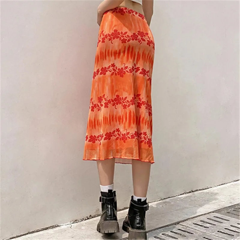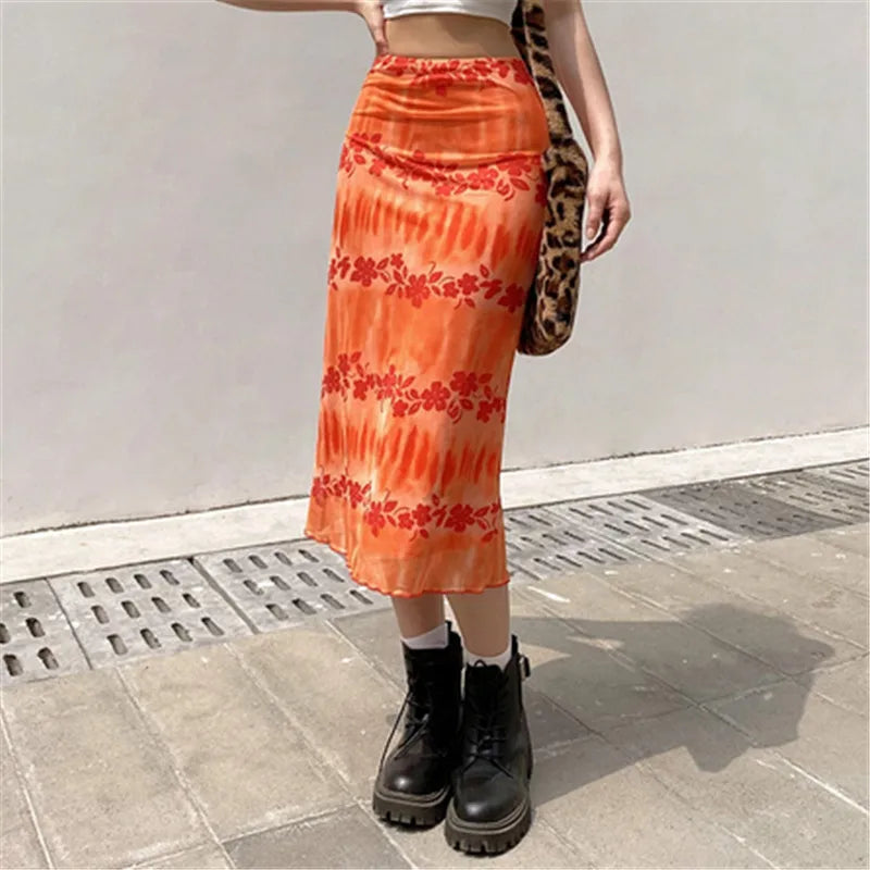 ロングオレンジボヘミアンフローラルY2Kハイウエストスカート