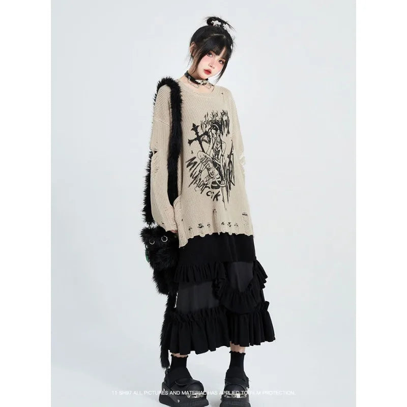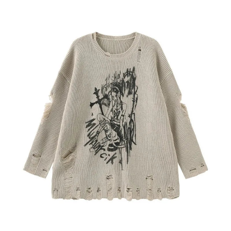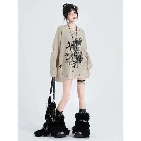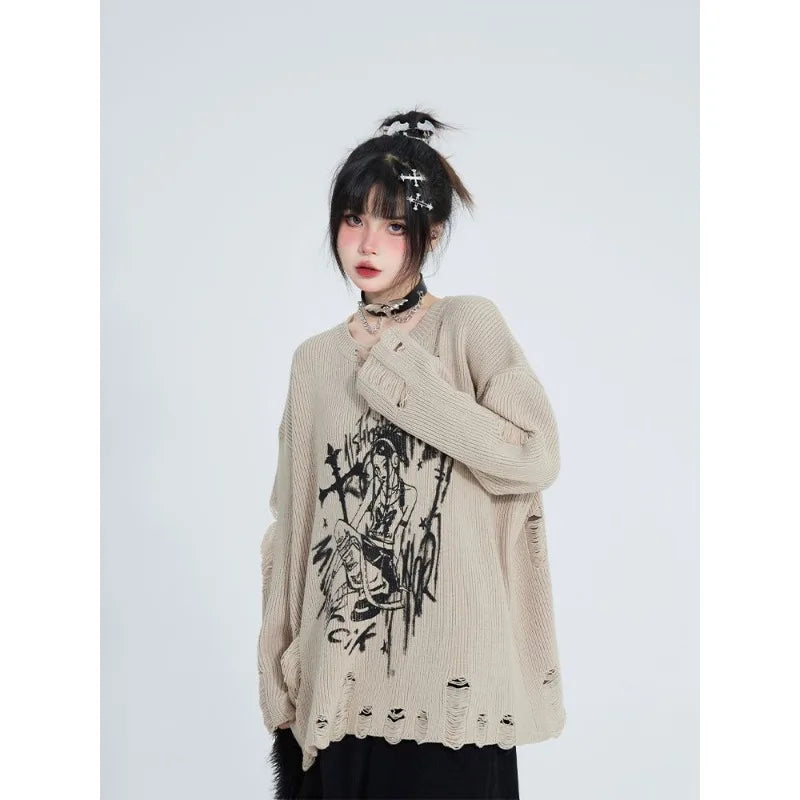 十字架と女の子の黒いアニメプリントのベージュゴシックセーター