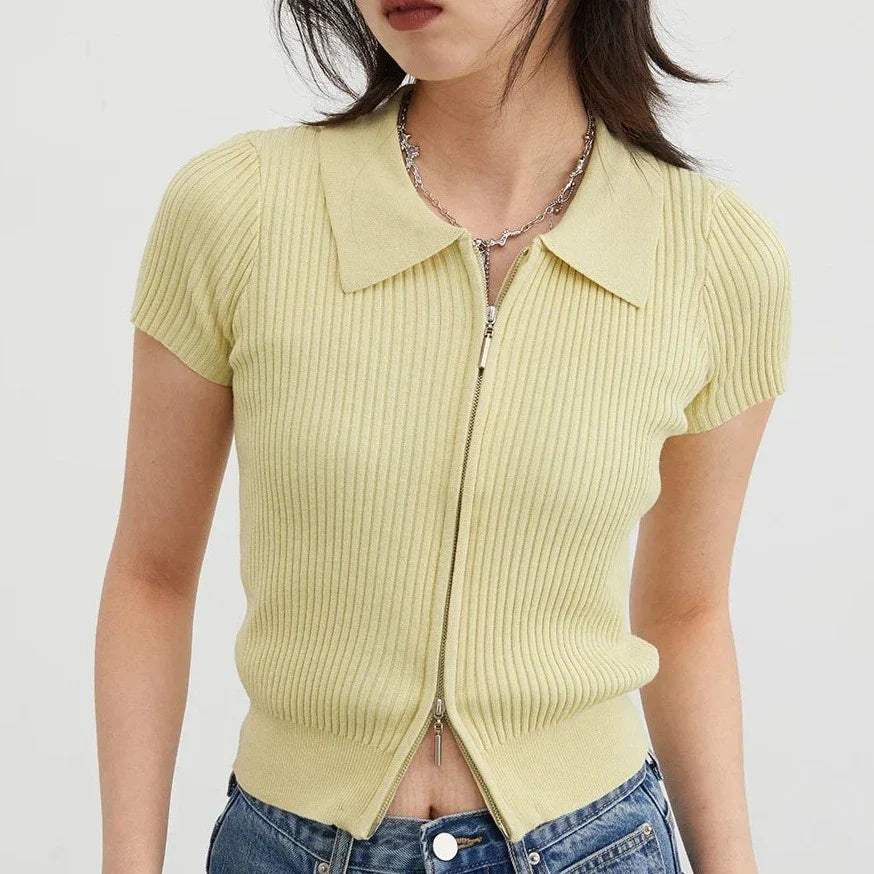 ジッパー付き韓国ニットカーディガン パステルイエロー