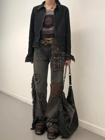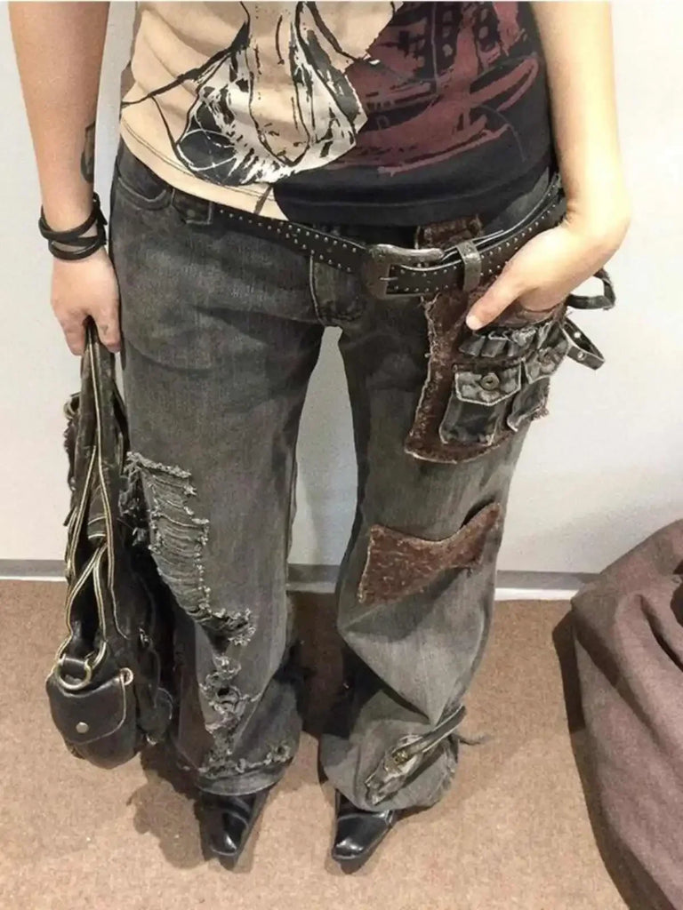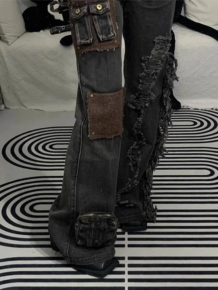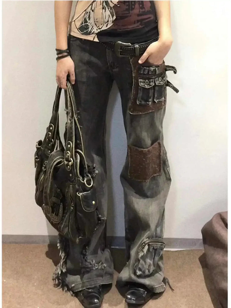 ハイウエスト パッチワーク カーゴスタイル ワークウェア ジーンズ