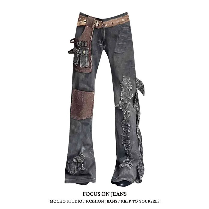 ジーンズ カーゴ フレア パッチワーク レディース スタイル ワークウェア ダメージ加工 ジーンズ