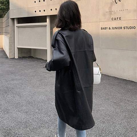 レディース用オーバーサイズレザーのブラックロングバイカースタイルジャケット