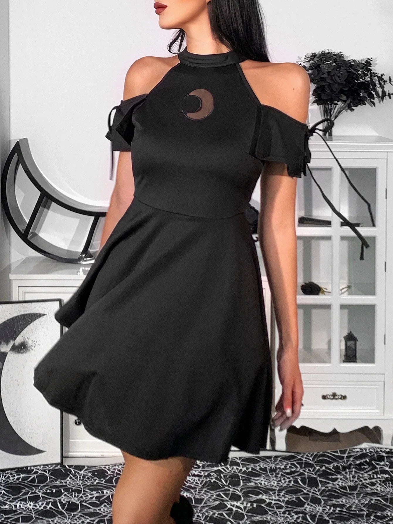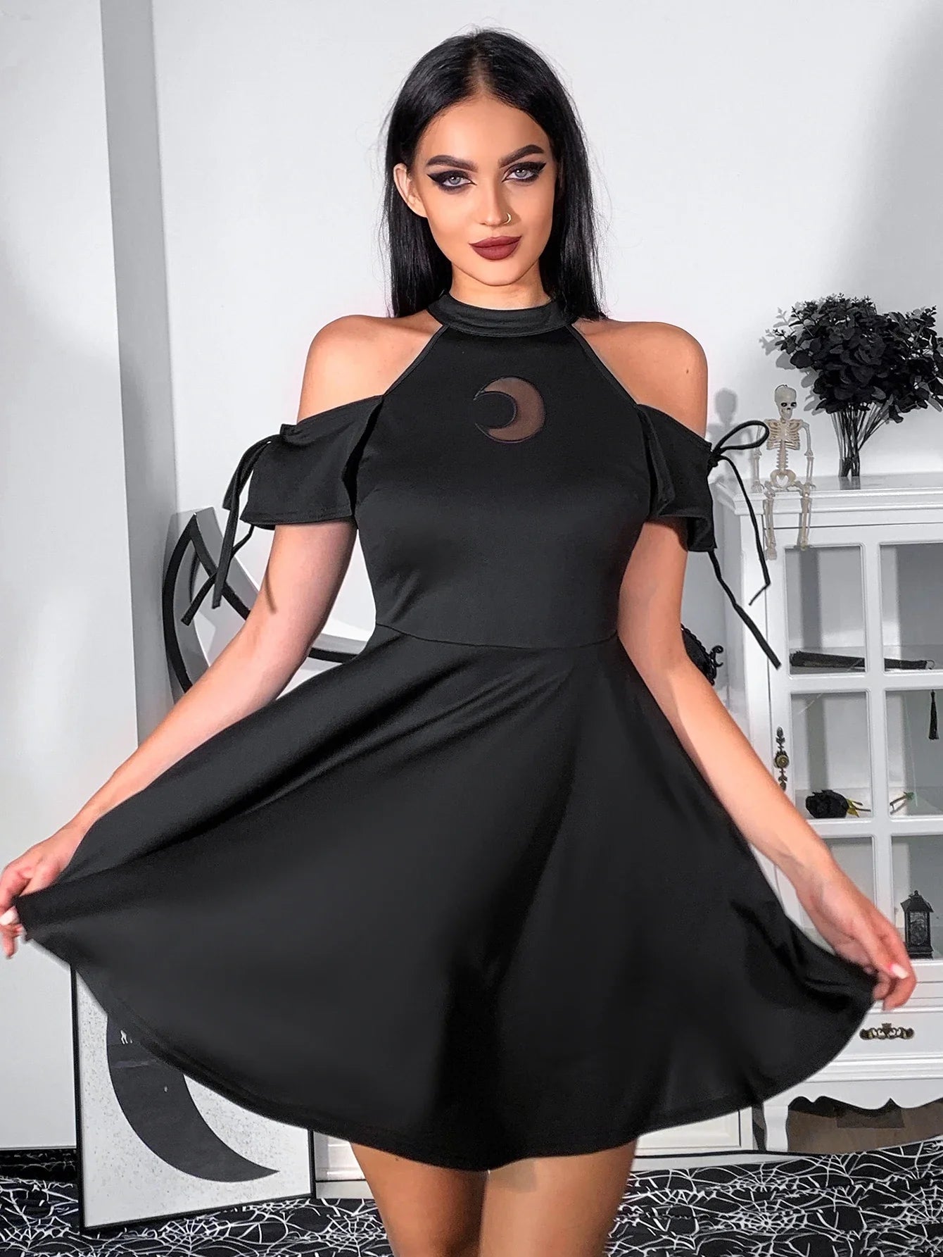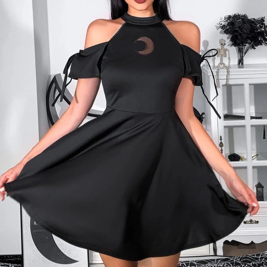 ミステリアスでありながらエレガントなゴシック サマー ドレスをご覧ください。ハイカラーとカットオフ スリーブのこのドレスは、肩を強調しながら、動くたびに美しいシルエットがあなたと一緒に踊ります。中央の繊細な月のモチーフがドレスにオリジナリティを加え、人混みの中でもスタイリッシュに目立ちたい人にぴったりです。このドレスは軽量で流れるような生地で作られており、晴れた日に快適に着用でき、あなたを定義するオルタナティブ スピリットを保ちます。お気に入りのアクセサリーと組み合わせて、都会での一日やシックな夜に大胆なルックを演出してください。オルタナティブ ワードローブに欠かせないこのアイテムで、自信を持ってエレガントにダーク サイドを見せてください。魔法が解き放たれます!