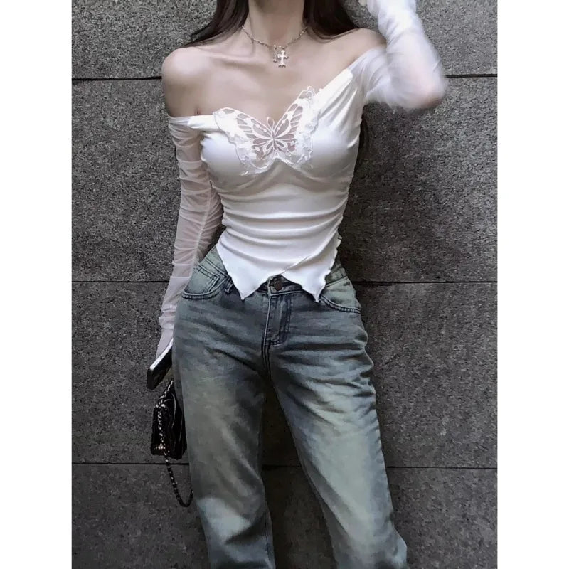 ホワイトクロップトップの韓国のエレガンスと魅惑の蝶