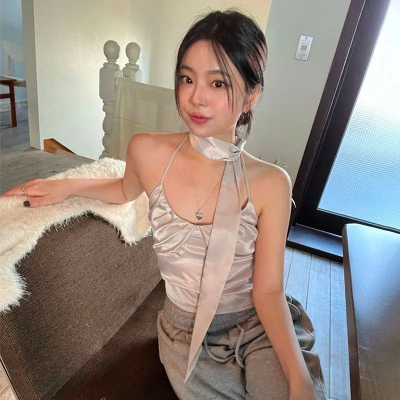 K-POPスタイルのスカーフ付きサテンキャミソールとバックレスパーティートップス