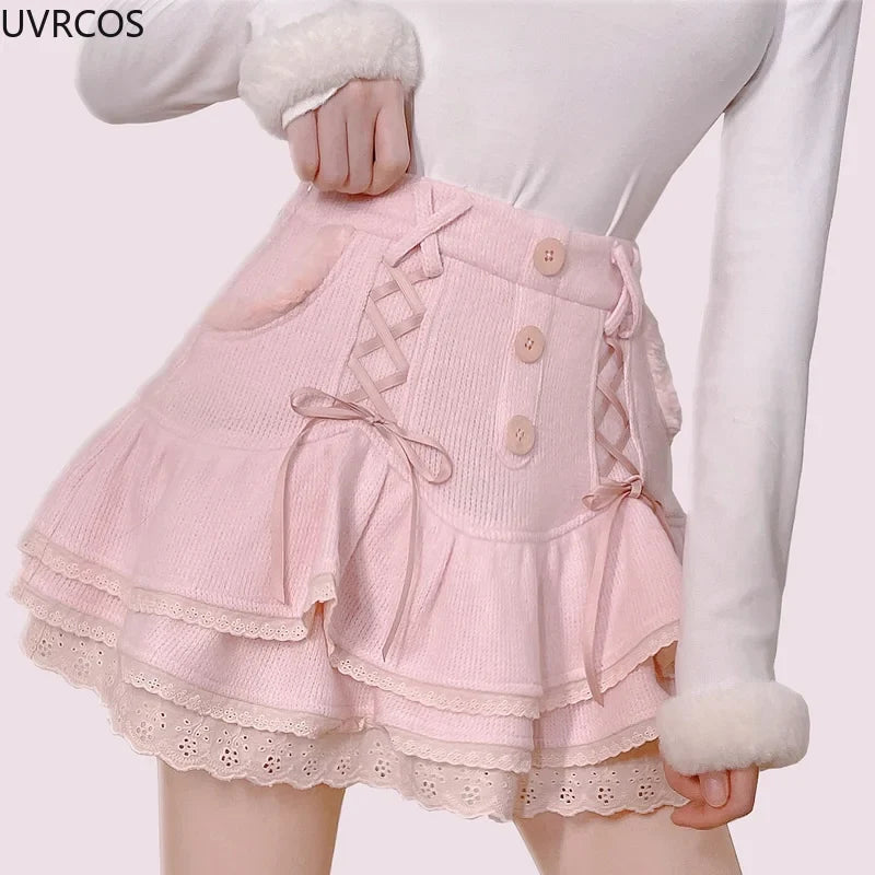 Lolita Kawaii のこの魅力的なミニスカートで、柔らかさと優雅さの極みを発見してください。これは、冬のワードローブに魅力を添える、オルタナティブ ファッションの真の逸品です。繊細なピンク色が優しさのオーラであなたを包み込み、穏やかで女性らしい方法で自分のスタイルを表現したい人に最適です。スカートは、フロントに垂れ下がる可憐なボタン、ウエストを優雅に強調するクロス レース、歩くたびに動きを加えるエアリーなフリルなど、複雑なディテールで魅了します。各トリムはレースで丁寧に飾られ、ロマンチックな外観を高めます。スカートは柔らかく快適な生地で作られており、エキサイティングな外観だけでなく、涼しい日にも完璧な着心地を保証します。