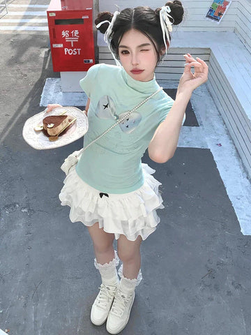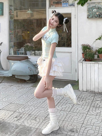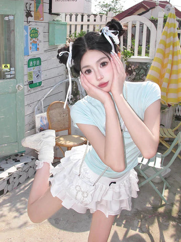 夏の散歩や夜のお出かけにぴったりな、フリル付きの魅力的なミニスカートで注目を集めましょう。軽くて流れるような生地で作られたこのスカートは、ティアードデザインで韓国スタイルのエッセンスをとらえており、ワードローブにちょっとした遊び心を添えます。ウエストには、甘美なケーキを思わせる繊細で遊び心のあるディテールが施されています。スカートは短く、膝上まで届き、シンプルなTシャツやフィットしたトップスと完璧にマッチし、魅力的なコントラストを生み出します。クリーム色のスカートは、大胆なアクセサリーや、モデルが履いている白いスニーカーのようなカジュアルな靴と合わせても、汎用性が高く、簡単に組み合わせることができます。軽やかで若々しい雰囲気のこのスカートは、夏の服装に魅力と軽やかさを加えたい方に最適なアイテムです。
