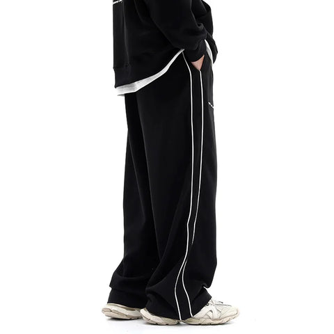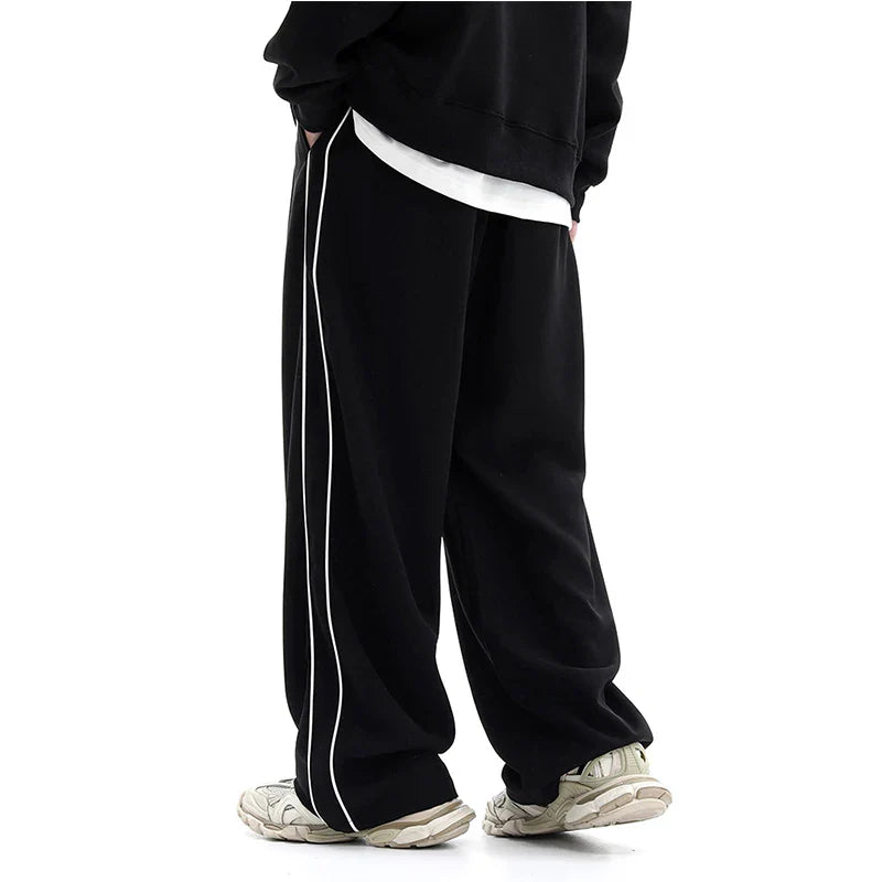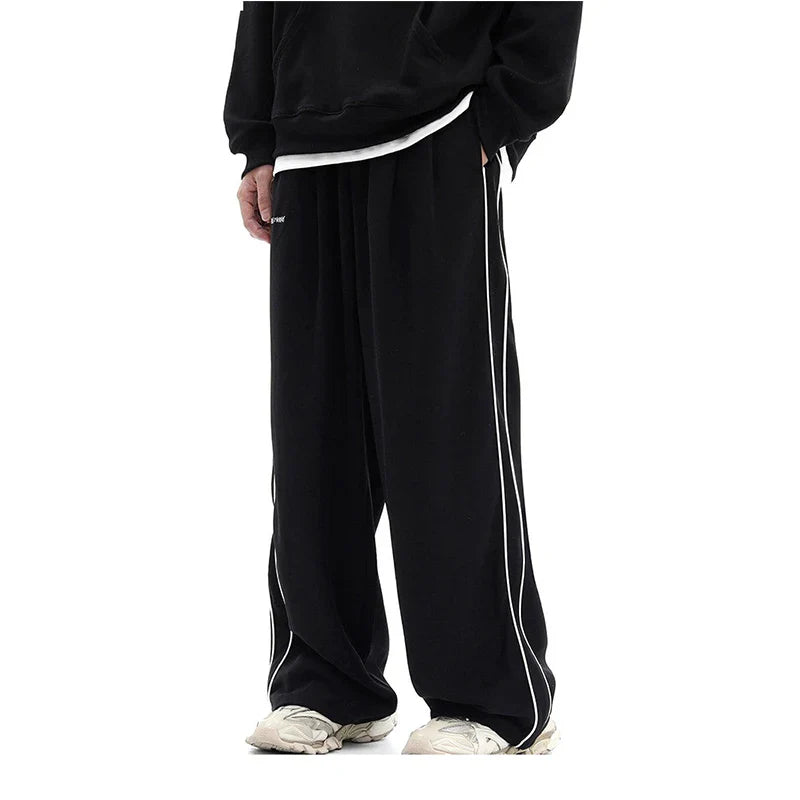 ストライプ柄のブラックテックウェアジョギングスーツで、オルタナティブなスタイルを演出