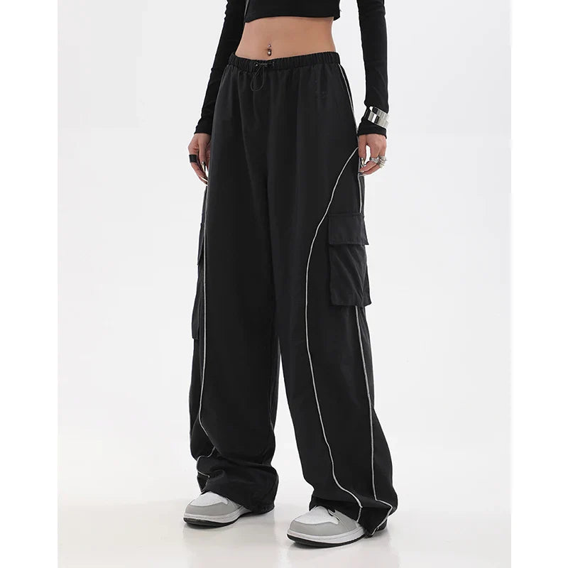 オルタナティブなアーバン ワードローブの必需品、テックウェア パラシュート パンツをご覧ください。大胆で機能的なスタイルを求める男性に最適です。ゆったりとしたフィット感とワイド レッグのこのスウェットパンツは、美的ステートメントであるだけでなく、毎日のアクティビティに快適な選択肢でもあります。このパンツは耐久性のある黒の生地で作られており、シルエットをダイナミックに強調する白いコントラスト ラインが特徴です。実用的でスタイリッシュなこのパンツには、必需品を簡単に収納できる特大ポケットがいくつか付いています。伸縮性のあるウエストバンドが完璧なフィット感を保証し、丁寧な職人技により、時の試練や一時的なトレンドに耐えることが約束されています。このパラシュート パンツは汎用性が高く、都市への旅行から自宅でのリラックスした時間まであらゆる用途に適しており、テックウェア ファッションの重要なアイテムです。