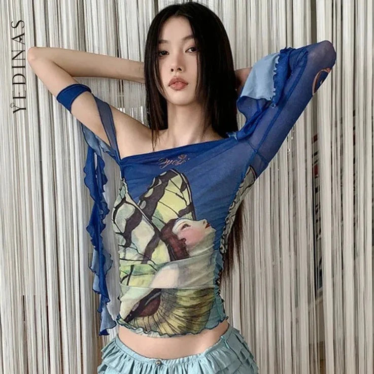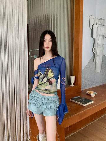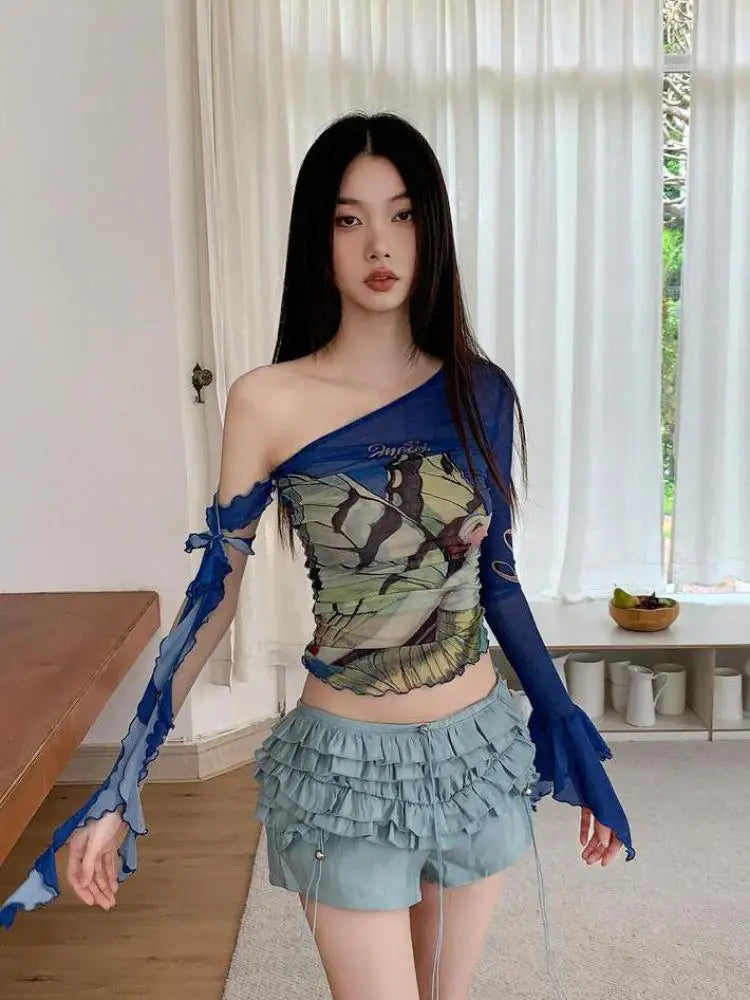 *アシンメトリー グランジ メッシュ トップ* で、大胆な夏の世界に飛び込みましょう。このニット トップは、革命的な魂を持つ人のために、オルタナティブな外観でデザインされており、暑い夏の間、あなたを涼しく保ちながら注目を集めること間違いなしです。この衣服の生地には、アート ギャラリーの白昼夢を思わせる芸術的なプリントが施されています。深いブルーが活気に満ちたシュールなシーンと対照をなし、魅惑的なデザインに視線を奪われます。片側が長袖、もう片側がノースリーブの不規則なカットは、「ユニーク」という言葉を定義します。生意気なフリルが甘いタッチを加え、慣習に逆らって期待をひっくり返します。この軽量で透け感のあるメッシュ トップは、前衛的なスタイルを保証するだけでなく、絶対的な天国のような快適さも保証します。