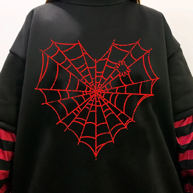 蜘蛛の巣と赤いストライプが入った黒い長袖シャツ