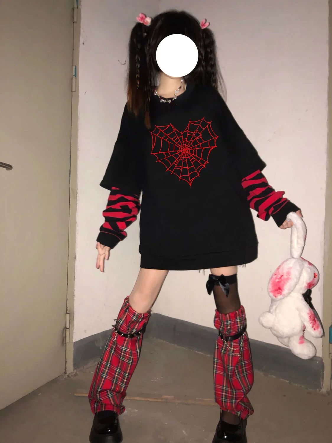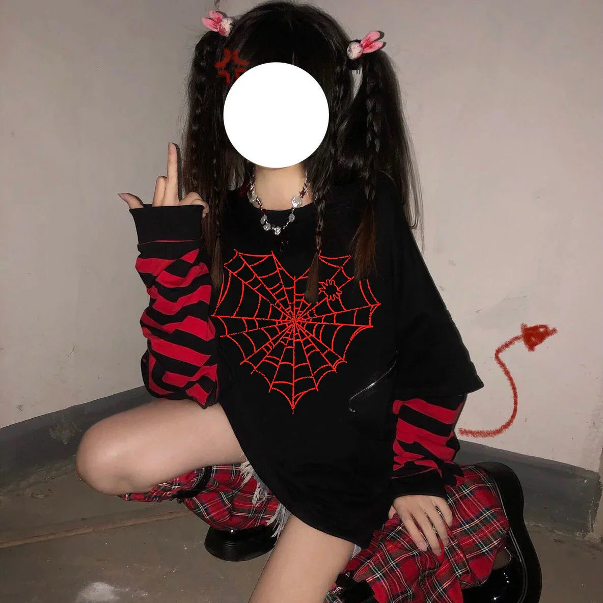 スウィートレディースゴスブラックロングスリーブフェイクツーピーススパイダーウェブジャパニーズパンク