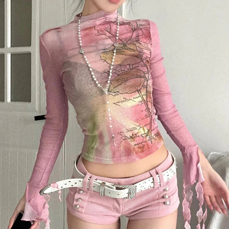 2000年代のフェアリーコアスタイルのピンクのメッシュトップスを送る