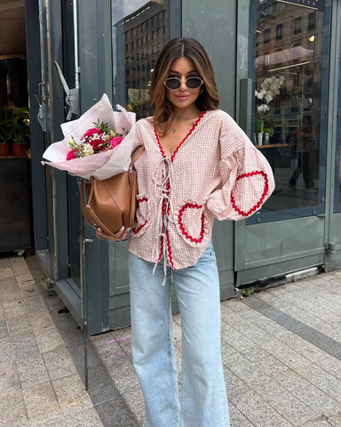 大胆な韓国スタイルと遊び心のあるロマンスが微妙に交差する完璧な組み合わせを体現したオーバーサイズのシャツに魅了されることでしょう。ベージュとホワイトのヴィシーチェックの生地が繊細な背景を作り出し、フロントポケットの縁取りの赤いハートがそれを強調し、強いコントラストを形成しています。ディテールはさらに進んでおり、ボタンプラケットとボリュームのある袖口の細いレースの遊びが、さりげなくオリジナリティをプラスしています。ハートポケットの縁とネックラインに沿って走る赤いスカラップエッジは、衣服に沿って穏やかな波を描き、布のラブレターの輪郭を彷彿とさせます。柔らかい生地のミックスで作られたこのオーバーサイズのシャツは、快適で動きやすく、カジュアルでありながら完璧に洗練された外観を強調します。
