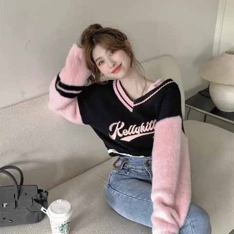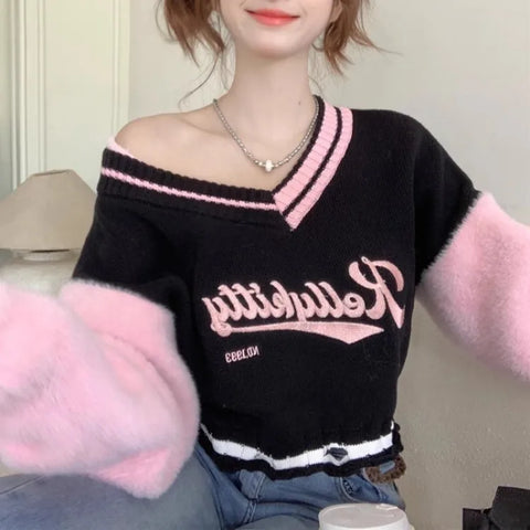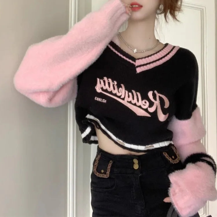 Black-pink two-tone crop top sweater with V-neck in the style of the 2000s