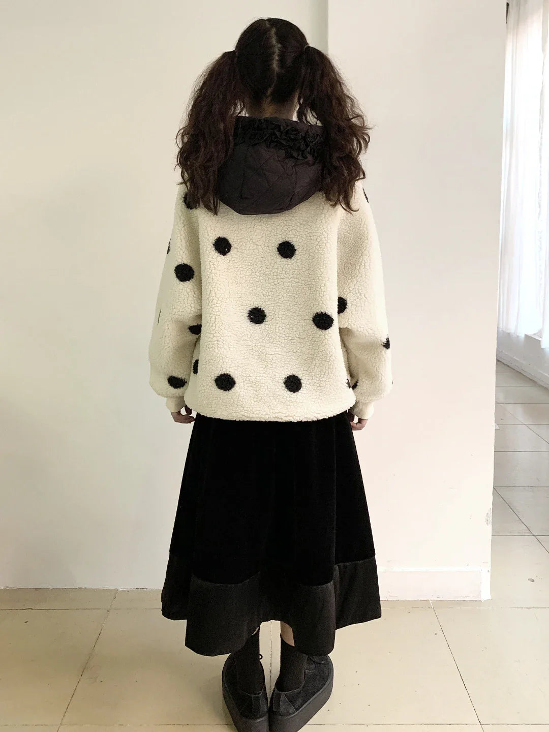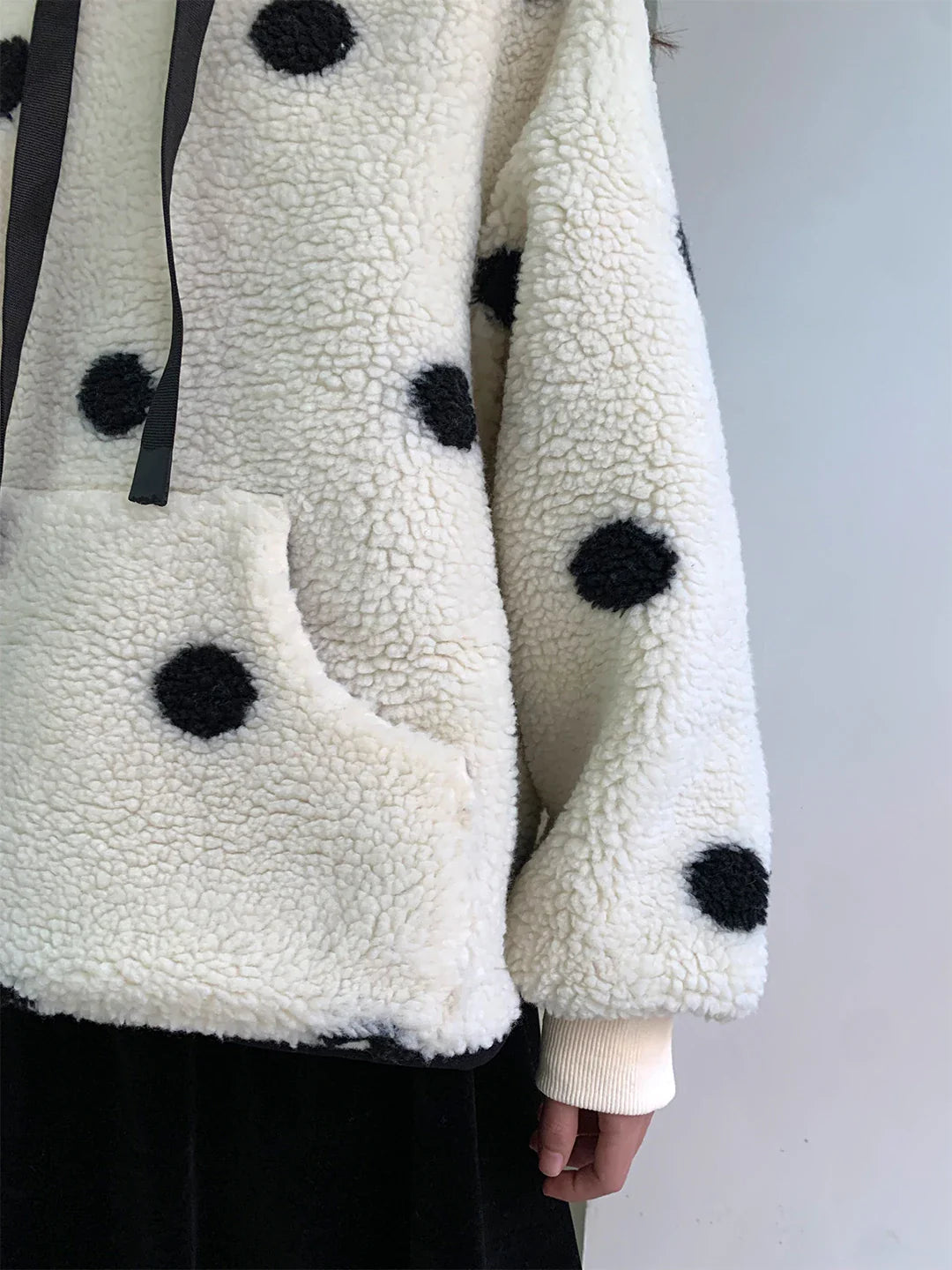 This versatile and characterful crew neck sweater is distinguished by its soft plush texture and dotted pockets. With its elegant story prints of black polka dot patterns on an off-white base, it adds a playful touch while knowing how to elegantly adapt to all your outfits. The sweater is designed to make a statement on cool autumn evenings with its pleasant combination of warmth and style. It is perfect for a relaxed day, as it is lightly loose-fitting, allowing you to move freely while staying trendy. With its neutral color combination, you can wear it with a velvet skirt or boyfriend jeans to achieve a stylish yet cozy look.