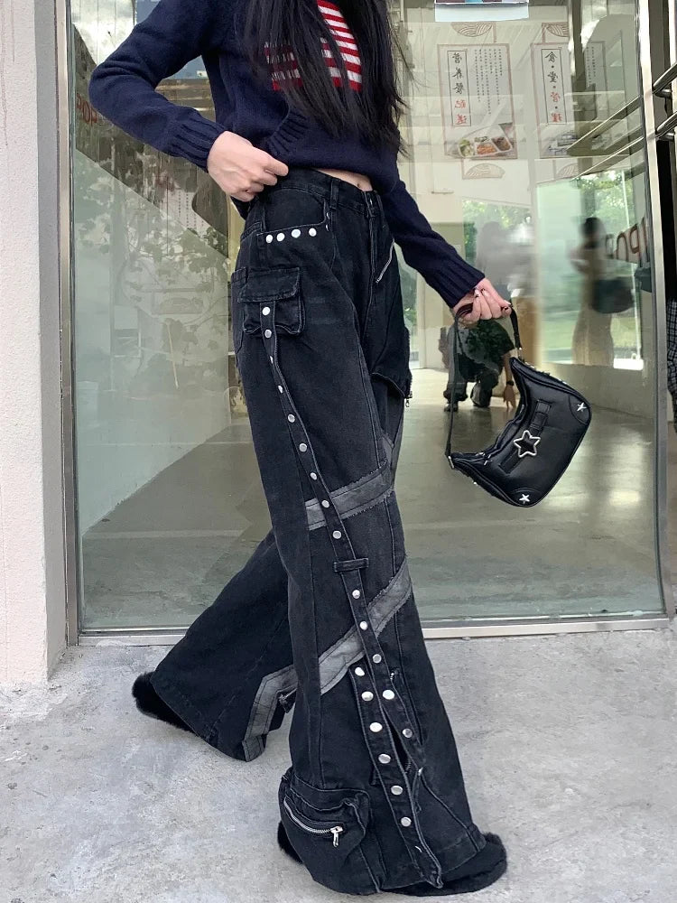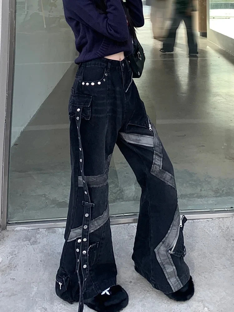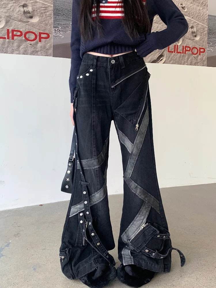 Dive into the daring world of alternative style with our Baggy Cargo Strap Patchwork Jeans Y2K, perfect for free spirits and fashionistas. In deep black, these denim pants offer a unique blend of twill and faux leather, combining comfort with a trendy urban aesthetic. The casual cut and high waist flatter every figure, creating a cool look in an effortless way.