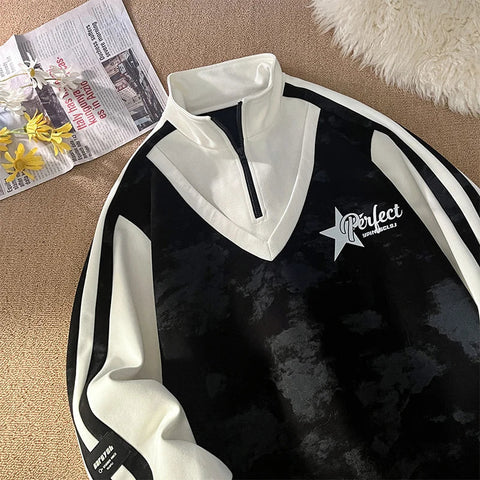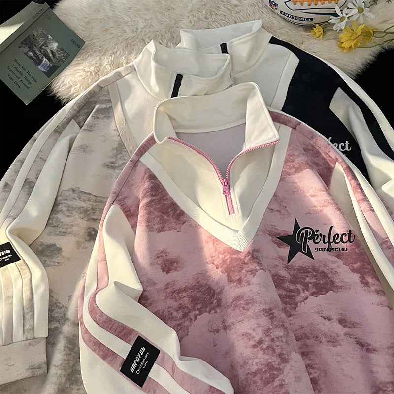 Harajuku Hoodie Oversized Tie-dye Distressed Half Zip Up