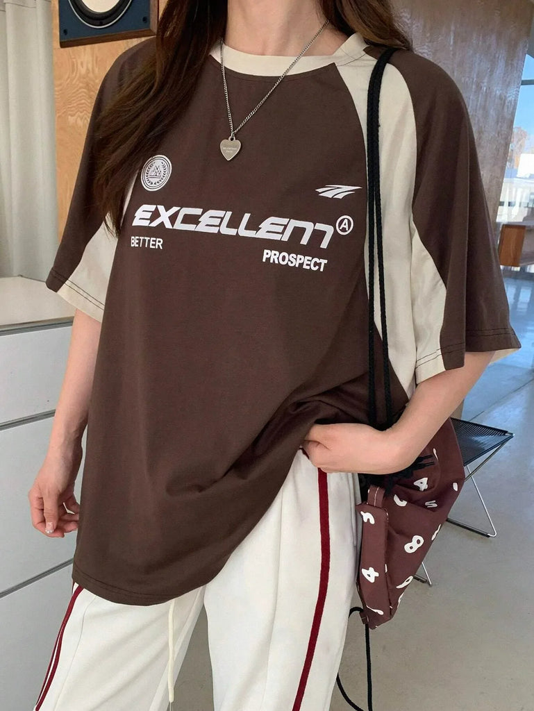 With our short-sleeve T-shirt in contrast colors, you are in the 2000s trend! This beautiful model plays with a shimmering palette of brown and beige tones, giving your alternative wardrobe a unique touch. It features a classic round neckline and is cut to fit comfortably while still looking casual. The T-shirt stands out not only for its bold design but also for the striking white inscriptions "EXCELLENT" and "BETTER PROSPECT," which add a sporty yet fashionable touch.