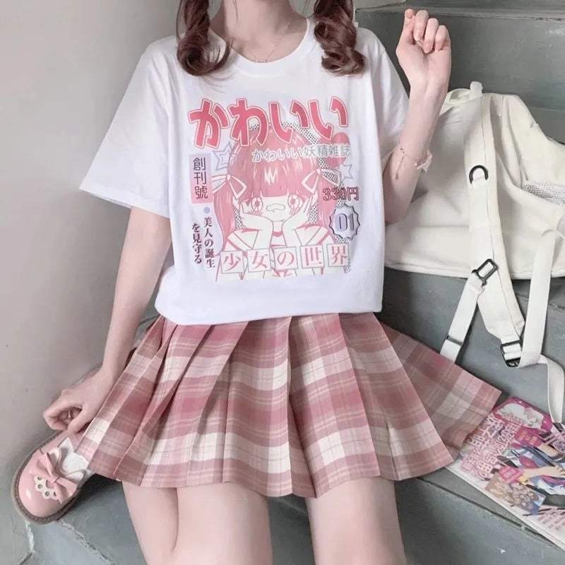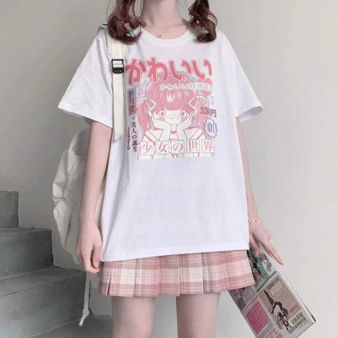 Echoes of Japanese Style Dive into the world of E-Girls with this T-shirt. The design is inspired by Japan, where Kawaii culture meets contemporary urban style. This pink and white T-shirt made of soft, breathable fabric is both a love letter to alternative fashion and a vibrant homage to Japanese animation. The face of an animated girl with cute facial expressions and intricate details proudly adorns the front of the T-shirt, surrounded by Japanese text that provides an authenticity straight from the streets of Tokyo. The palette of pink tones highlights the playful character of the T-shirt, while the casual cut offers comfort and style for your daily adventures. Whether you're indulging in the latest manga or going for a walk with friends, this pink Egirl T-shirt is the perfect choice for anyone wanting to add a touch of fantasy to their wardrobe. Pair it with oversized jeans or a lace-up skirt for a complete outfit that exudes the young, rebellious spirit of E-Girl culture.